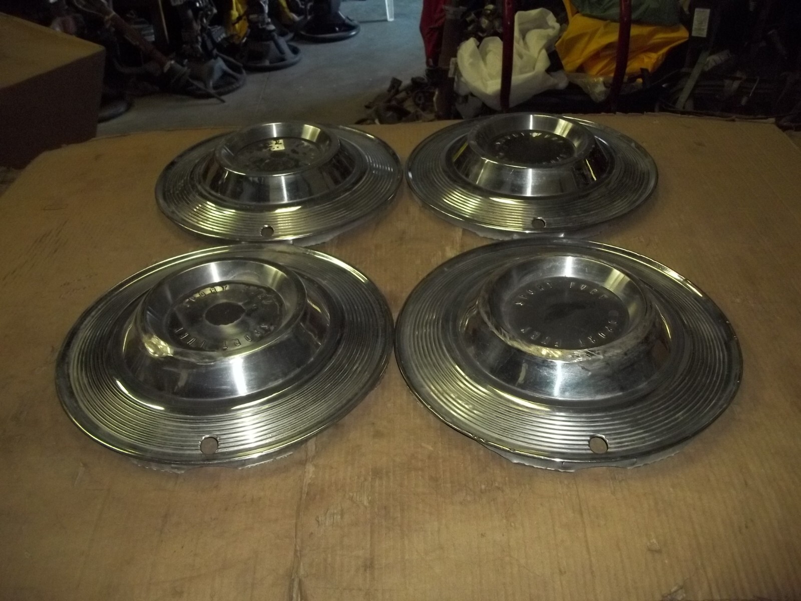 A set of FOUR (4) LATE 62-63 Plymouth Sport Fury 14" factory full wheel covers.This is a VERY used set with MANY deep scratches / scrapes and large dings / dents.These scratches / scrapes and dings / dents will be noticeable from even a short distance.Outer most sections have heavy curb damage.Entire edges dinged and dented.Ring sections dented down and uneven.One cover split through metal on outer lip as pictured.The original finish and painted areas are VERY faded and worn due to time.Oxidation and corrosion.Staining that does not polish away.Paint peeling completely off.Bent out of round when laid flat but attach to wheels as designed.Poor driver car quality or only better than nothing at all.On a scale from 1 to 10, these rate a "4" in condition.Buyer to pay shipping with a flat rate of $20 within the continental U.S..Elsewhere there are additional charges.Accept most methods of payment.California buyer to pay state sales tax.