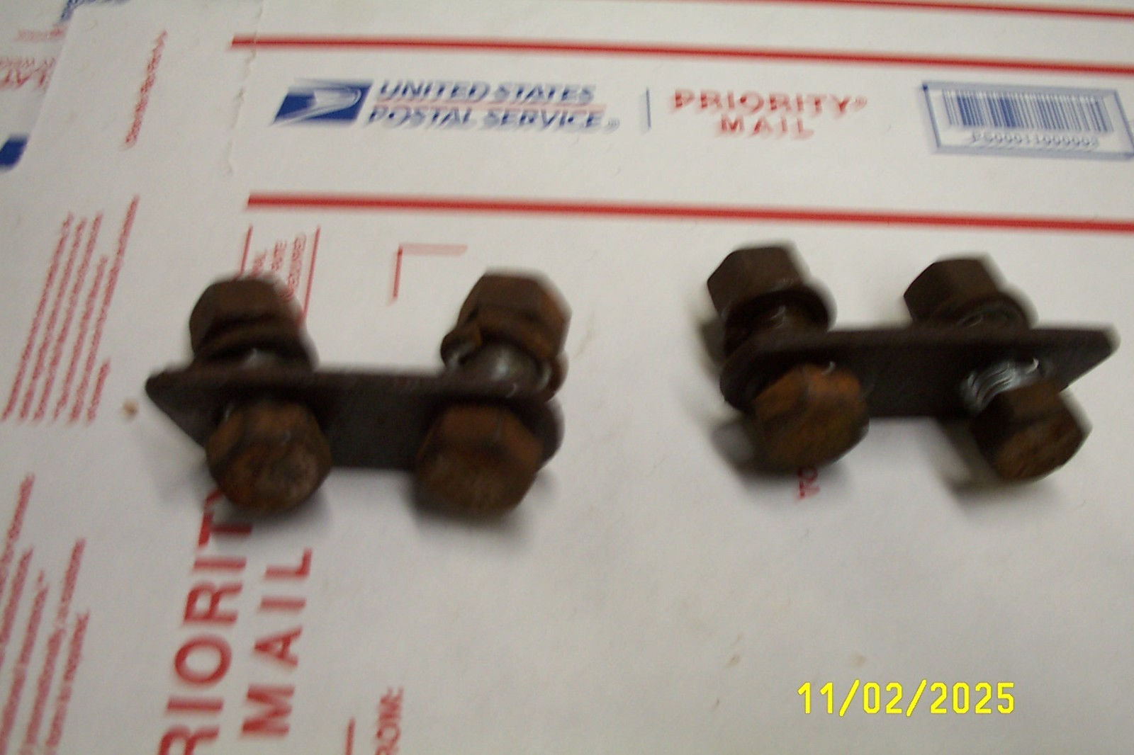 1963 IMPALA AND FULLSIZE CHEVROLET FRONT BUMPER SPLICE MOUNT BOLTS AND REINFORCEMENT BRACKETS. ATTACHES ENDS TO CENTER BAR.SURFACE RUSTY ,I LEAVE POSITIVE FEEDBACK WHEN I RECEIVE IT