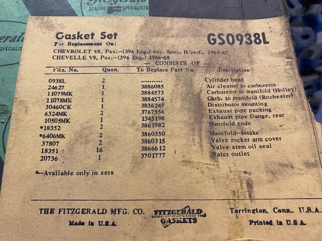 1965 1966 1967 CHEVROLET V8 396 ENGINE GASKET SET BBC CHEVY NOS FITZGERALD 650 9