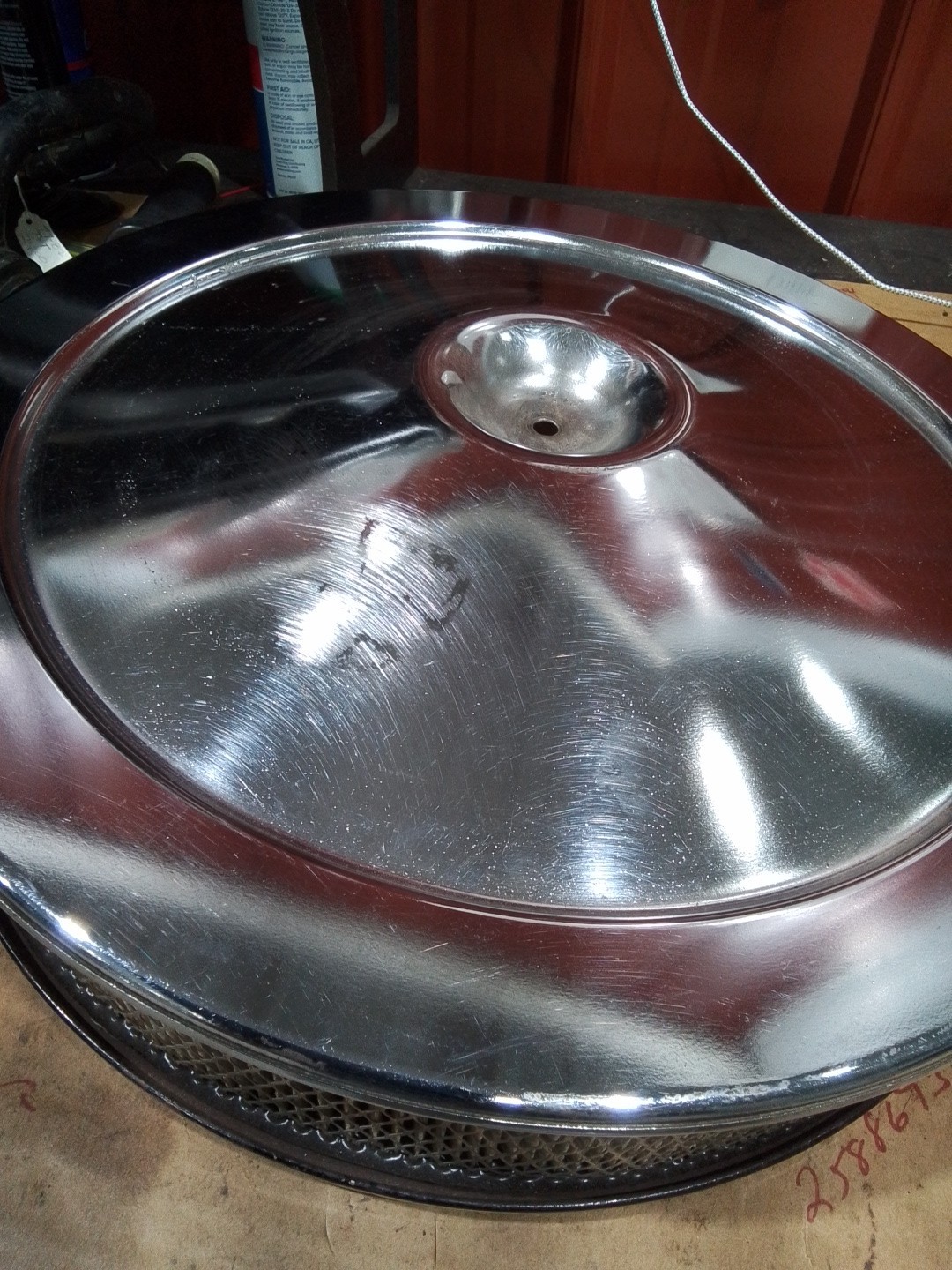 Look at pics and decide if this is correct for your application. Second Pic shows where original decal removed, put new one back in that area. Third pic very small ding, chrome is perfect for survivor. Hole is 5 inches across, base is original paint and breather at 90 degree. Location shelf C #O2, YES flame arrestor stamped GM on edge.