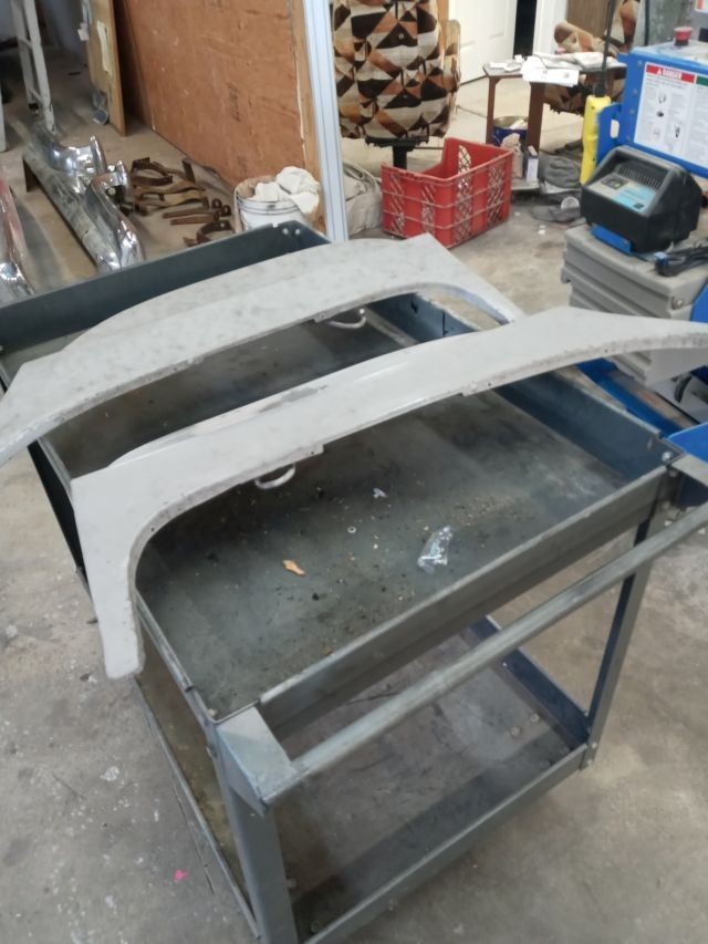 Very nice shape fender skirts with trim. One has been repaired along the side. This was done at some point early its life as the paint finish was not noticeable from new. They were sand blasted and pictures taken, then primed and trim attached. Again pictures taken. Trim piece both look very good along showing edges. The areas where they attach show some wear, but now damaged to a point of non repair if wanted.