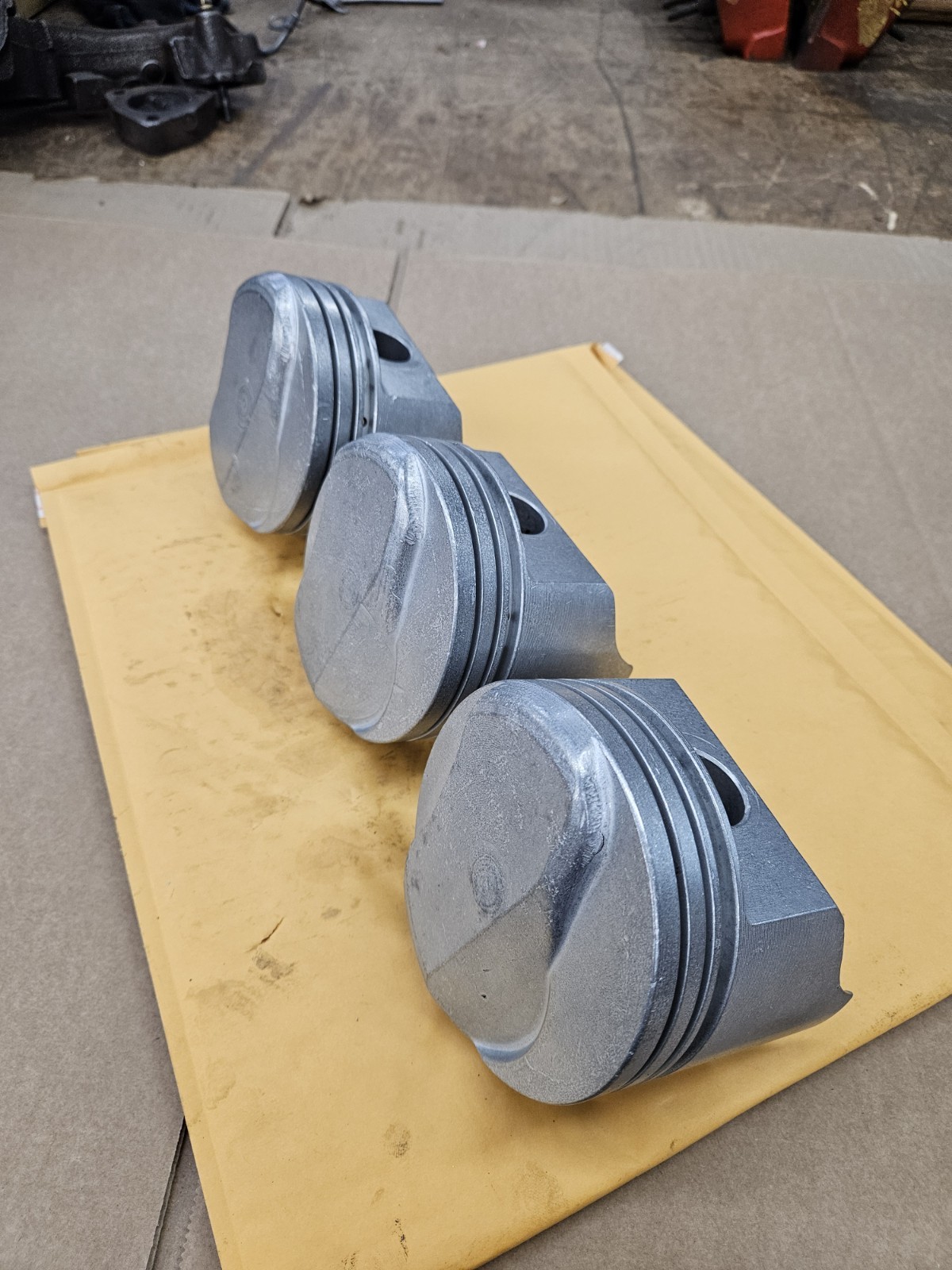 The product is a set of three GM L72 Tri-Power COPO Forged Dome Pistons specifically designed for 1966-1969 Chevy Hi-Performance 427 engines. These high-performance pistons are made of forged aluminum with a 4.25" piston diameter and 4.25" cylinder bore diameter. They are vintage parts with a standard bore size, suitable for big block Tri-Power Corvette and Camaro COPO engines. The manufacturer part number is 3888304, and they are genuine GM TRW pistons. These pistons are ideal for enthusiasts looking to complete a set or have spares for next rebuild. THREE ORIGINAL GM 427 PISTONS WITH PART NUMBER 3888304 ON THEM. VERY GOOD CONDITION. ONE HAS A SCUFF ON THE SKIRT BUT STILL USEABLE. SEE THE LAST PICTURE OF 24. #6656MATT