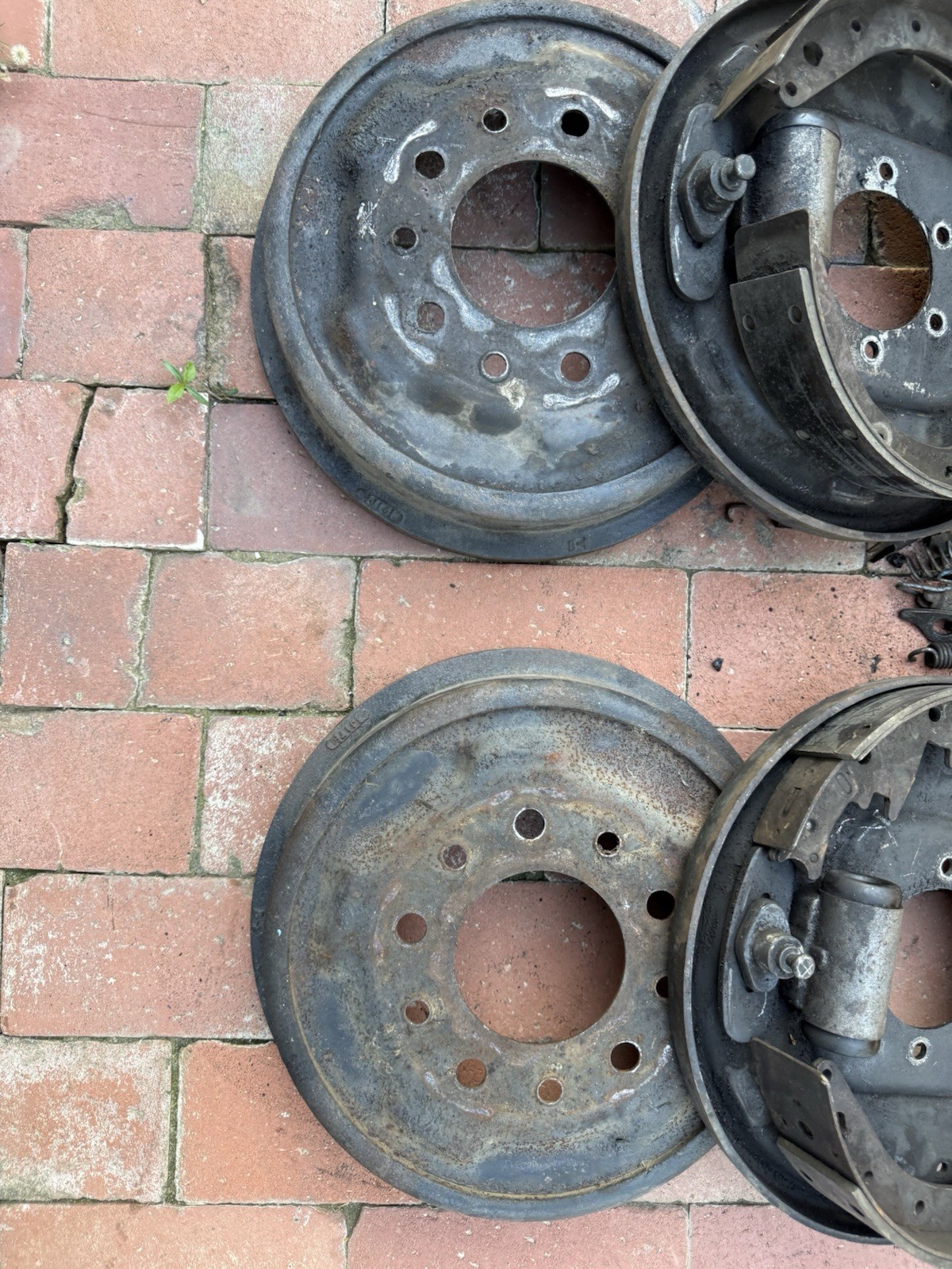 Original Ford Early Bronco front drum brake assemblies removed during restoration. Includes complete left and right front brake setups with original backing plates, brake drums, wheel cylinders, springs, adjusters, and all related hardware shown. Factory front drum brake components and not reproduction parts. Used condition with normal age wear and surface rust. Drums and components are complete and ideal for rebuilding, stock restoration, or as original cores.