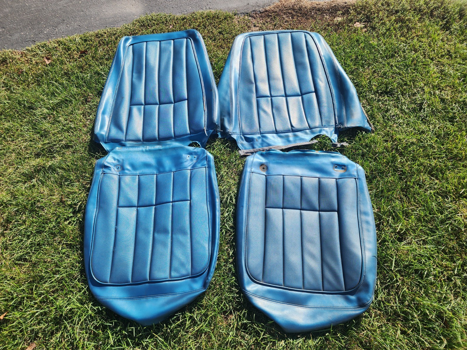 Used set of driver quality factory seat covers removed from a 1968 Chevy Corvette years ago. These are different than the 1969, as as those had holes for the headrest mounting bars on the top through the fabric. There are a few flaws as shown, but no rips or torn areas. The color is blue, one set looks somewhat darker, than the other set, likely the drivers side due to wear or discoloration for use. Good for a survivor car, clearly not for a show car. Perfect for a drivers where the seats are worn beyond repair and someone looking for an original set that matches the originality of the car, without going with new aftermarket covers on an original car.