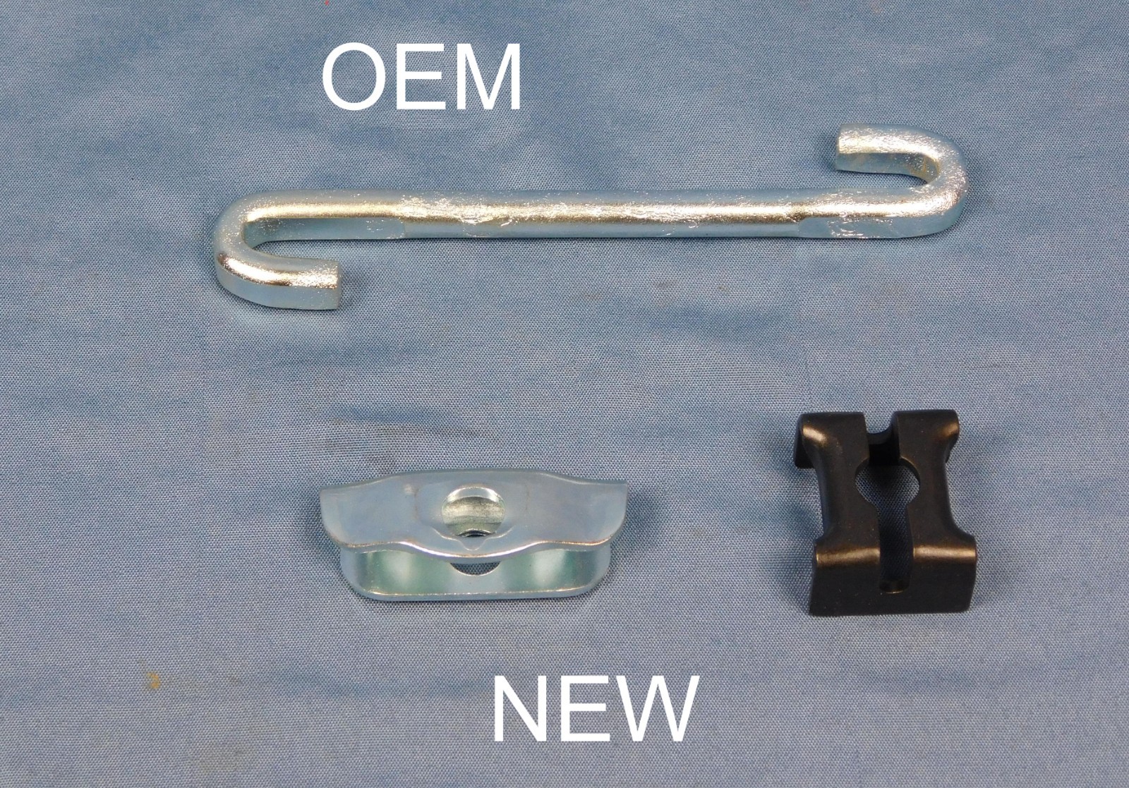 These parts are for the parking brake cable system underneath the vehicle. The hook is original OEM. The other parts are reproduction.