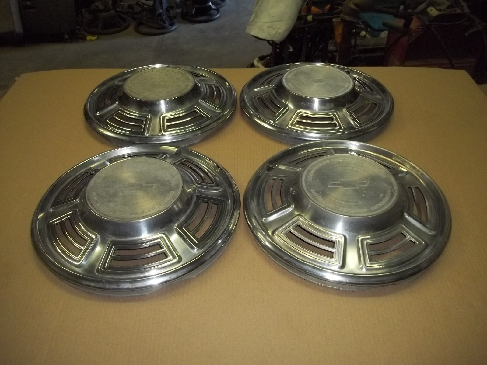 A set of FOUR (4) 1970 Chevrolet Chevelle 14" factory full wheel covers.This is a VERY used set with MANY large dings / dents and deep scratches / scrapes.These dings / dents and scratches / scrapes will be noticeable from even a short distance.The original finish is VERY faded and worn due to time.Paint worn off and color faded away.Oxidation and corrosion.Staining that does not polish out.Center emblems pitted and lost all color.Emblems lifting up.Slightly bent out of round when laid flat but attach to wheels as designed.Poor driver car quality or only better than none at all.On a scale from 1 to 10, these rate a "5" or less in condition.Buyer to pay shipping with a flat rate of $25 within the continental U.S..Elsewhere there are additional charges.Accept most methods of payment.California buyer to pay state sales tax.