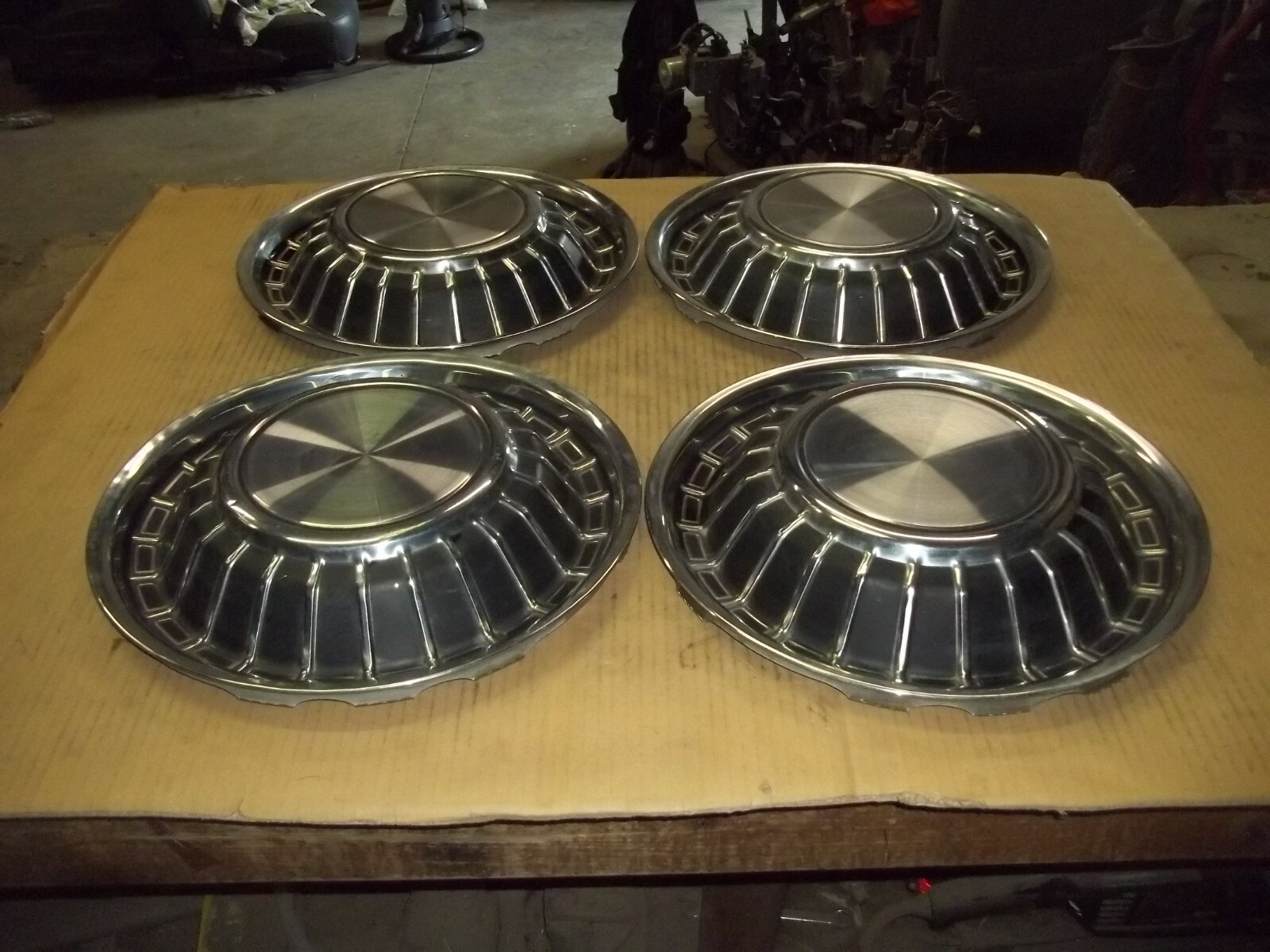 A set of FOUR (4) 1970 Mercury Passenger Car 15" factory full wheel covers.Black trim finish.This is a good used set with MANY dings / dents and scratches / scrapes.These dings / dents and scratches / scrapes will be noticeable from even a short distance.Entire outer edges dinged and dented.The original finish is VERY faded and worn due to time.Paint scratched and worn off.Faded different shades.Oxidation and corrosion.Staining that does not polish out.Slightly bent out of round when laid flat but attach to wheels as designed.Driver car quality.On a scale from 1 to 10, these rate a "6" in condition.Buyer to pay shipping with a flat rate of $25 within the continental U.S..Elsewhere there are additional charges.Accept most methods of payment.California buyer to pay state sales tax.