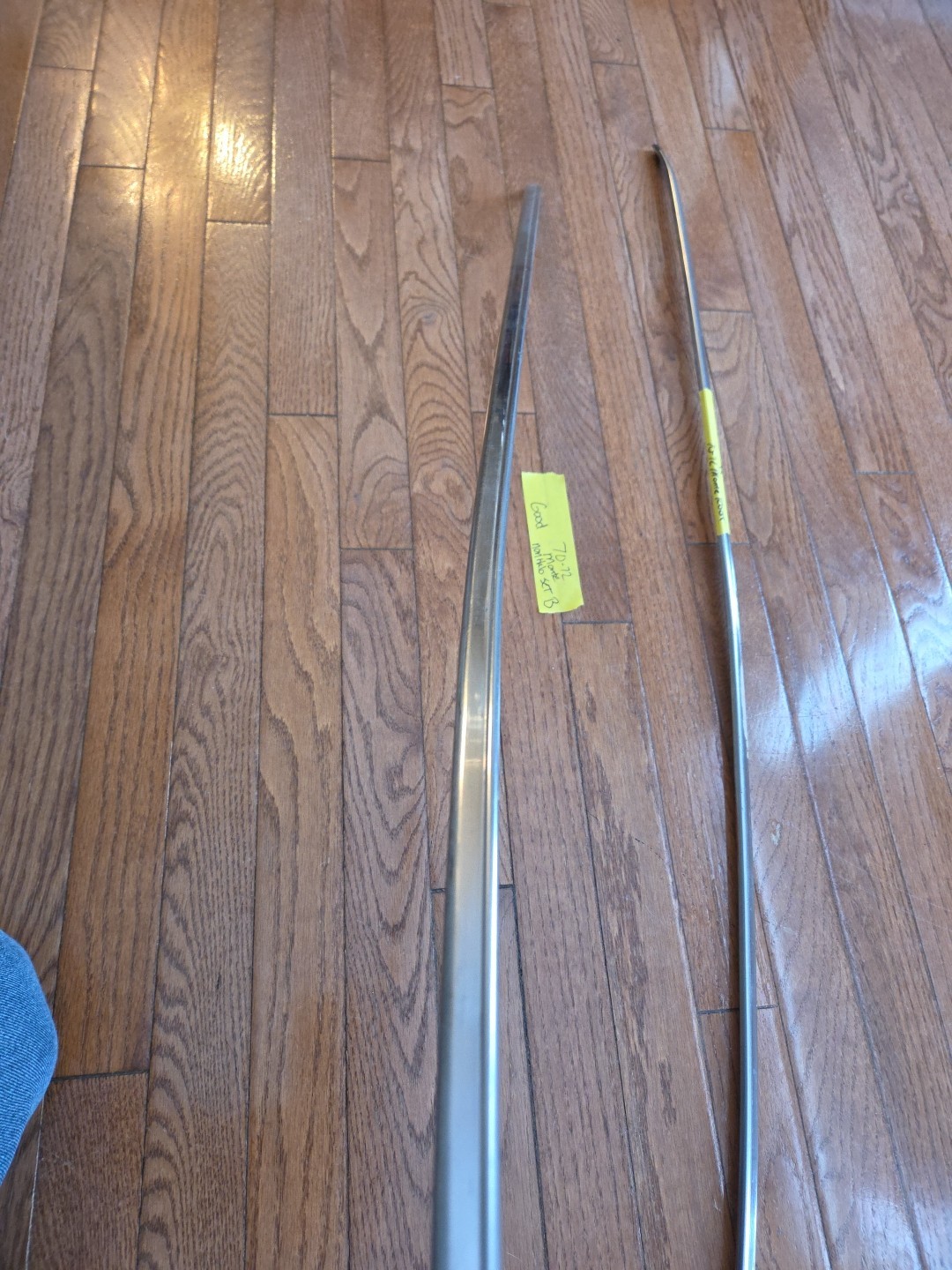 THIS IS TRIM LEFT OVER FROM A RESTO, THERE IS 2 PIECES, THEY GO ON THE ROOF. NON HALO THESE ARE THE LATER STYLE. 1 IS PRETTY NICE THE OTHER HAS A OUTER DING AND FEW INSIDE EDGE AREAS NEED ATTENTION NOT SEEN. I HAD TON OF MOULDINGS FOR MY CAR NOW NOT NEEDED... THIS IS SET B.