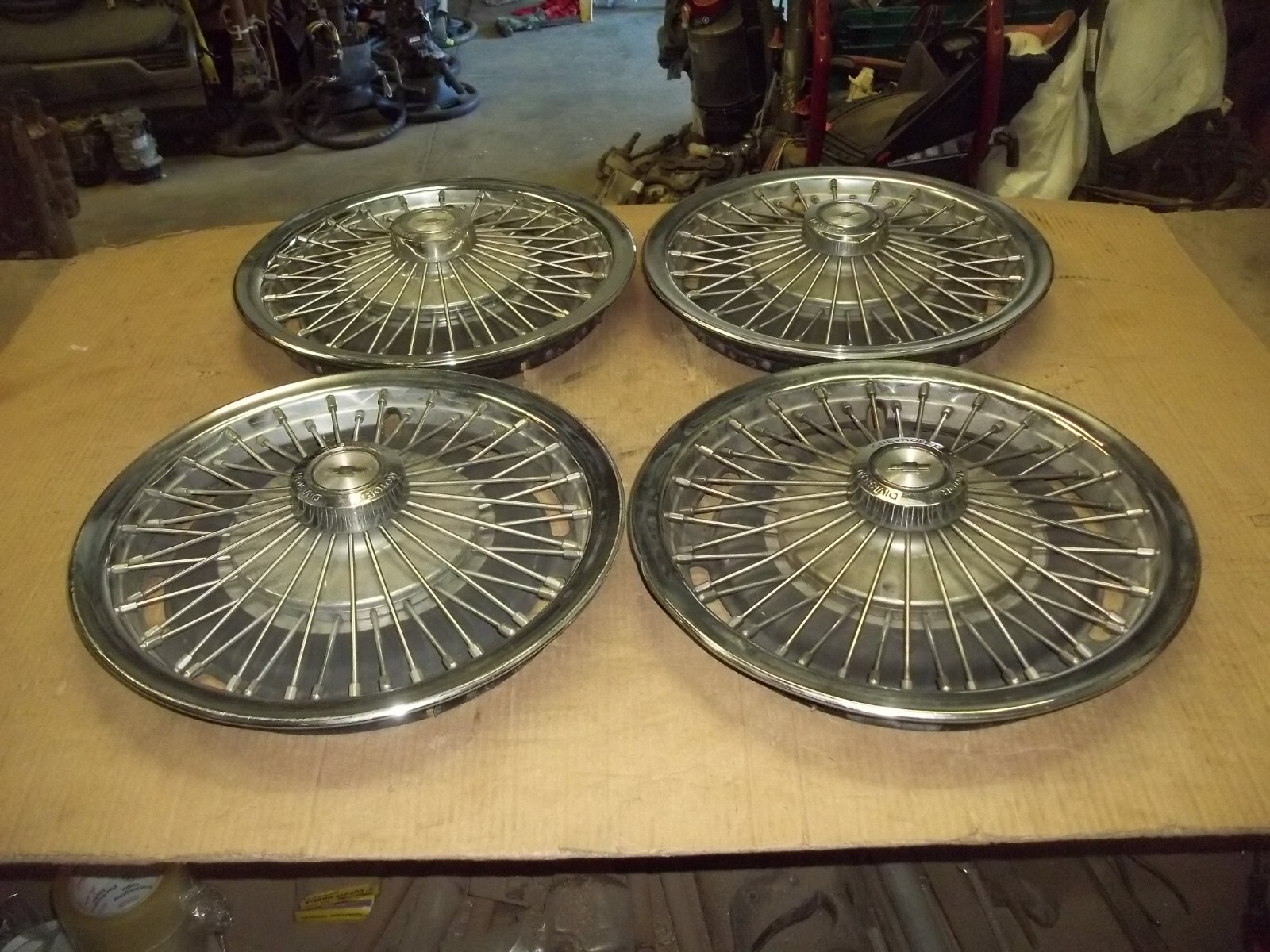 A set of FOUR (4) Chevrolet 14" factory metal WIRE wheel covers.Fit the models listed below.Match pictures for correct replacement.Non locking type.Narrow or shallower design that do not stick out as far from wheel.This is a VERY used set with MANY deep scratches / scrapes and large dings / dents.These scratches / scrapes and dings / dents will be noticeable from even a short distance.Entire outer edges curb damaged with dings and dents.Outermost die cast centers curb scraped.The original finish is VERY faded and worn due to time.Oxidation and corrosion.Staining that will not polish off.Pitting and curb gouges on die cast centers.Shine or brightness of finish faded different shades.Paint worn and peeling off.Many spokes are curb scraped and bent out of line.Slightly bent out of round when laid flat but attach to wheels as designed.Driver car quality.On a scale from 1 to 10, these rate a "5" in condition.Buyer to pay shipping with a flat rate of $35 within the continental U.S..Elsewhere there are additional charges.Accept most methods of payment.California buyer to pay state sales tax. 1970 CHEVROLET PASSENGER CAR 14" 1970 CAMARO 14" 1970 CHEVELLE 14"