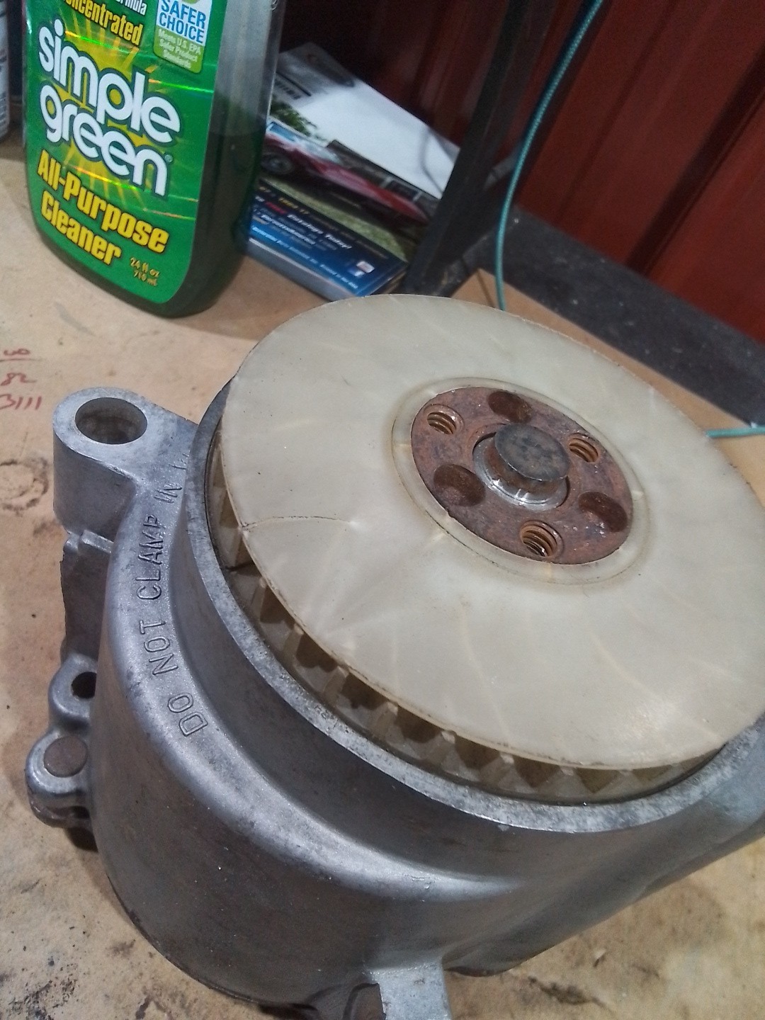 Original case dated 168th day of 1970 back cover looks like dated 119th. Cover was removed prior to me. Will need to be gone thru before use. Has correct sbc headmark bolts for cover. White fan has crack but could probably be used. Direct any QUESTIONS to last Pic. D155 #70