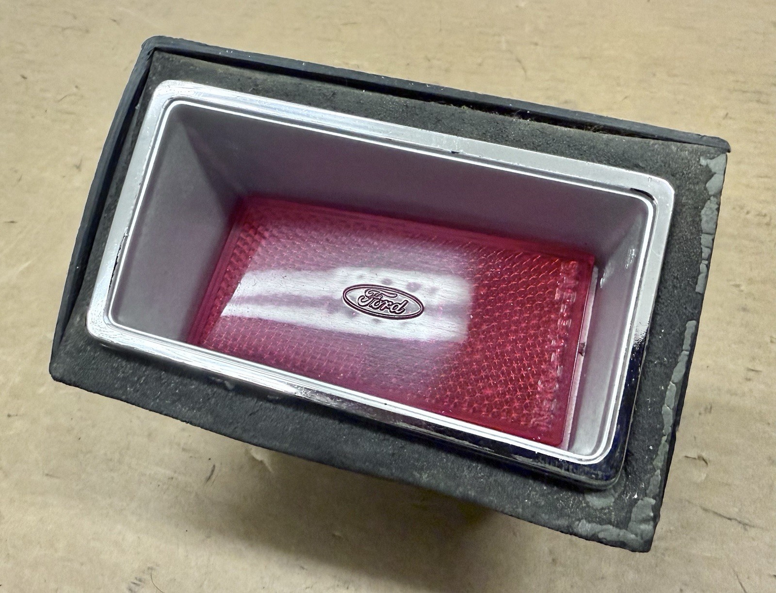 **Up for sale is a used Rear Marker Lamp Assembly for the left side of a 1970 Ford Galaxie 500 or LTD. The assembly is in overall good condition and could be considered driver or survivor quality. The red lens has good color and does not show any damage. Part number D0DB-15A428-A is on the back of the lens housing. The chrome finish on the bezel is bright with minimal pitting and speckling. Part number D0AB-15A467-B is on the back of the bezel. The plastic retainer doesn’t show any cracks or breaks.**
