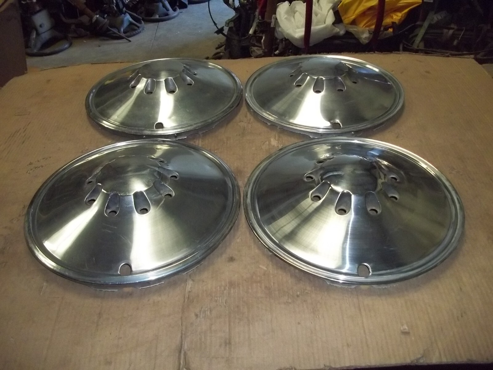 A set of FOUR (4) 1971 Plymouth Passenger Car, Valiant and Barracuda 14" factory full wheel covers.Outer edges differ in height and design as pictured.This is a VERY used set with MANY large dings / dents and deep scratches / scrapes.These dings / dents and scratches / scrapes will be noticeable from even a short distance.Entire faces and edges curb damaged.Flat sections dinged and dented uneven.The original finish is VERY faded and worn due to time.Oxidation and corrosion.Staining that does not polish out.Paint worn and peeling.Slightly bent out of round when laid flat but attach to wheels as designed.Poor driver car quality.On a scale from 1 to 10, these rate a "5" or less in condition.Buyer to pay shipping with a flat rate of $25 within the continental U.S..Elsewhere there are additional charges.Accept most methods of payment.California buyer to pay state sales tax.
