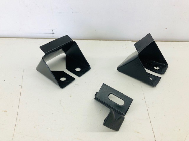1971-73 Mustang Lower Windshield Bracket Set - Driver Quality. This Windshield Bracket Set attaches to the cowl and holds the bottom of the windshield in place so it doesn't slide downward. There are three pieces, the small bracket is in the middle and the other two are on either side towards the ends of the windshield. They have been beadblasted to bare metal, primed in epoxy primer, and painted back to a satin black. You will need to add the rubber pads back on the larger pieces. There is pitting on the brackets (see pictures), but it does not effect anything. If you are missing your windshield brackets, then these are for you!!!