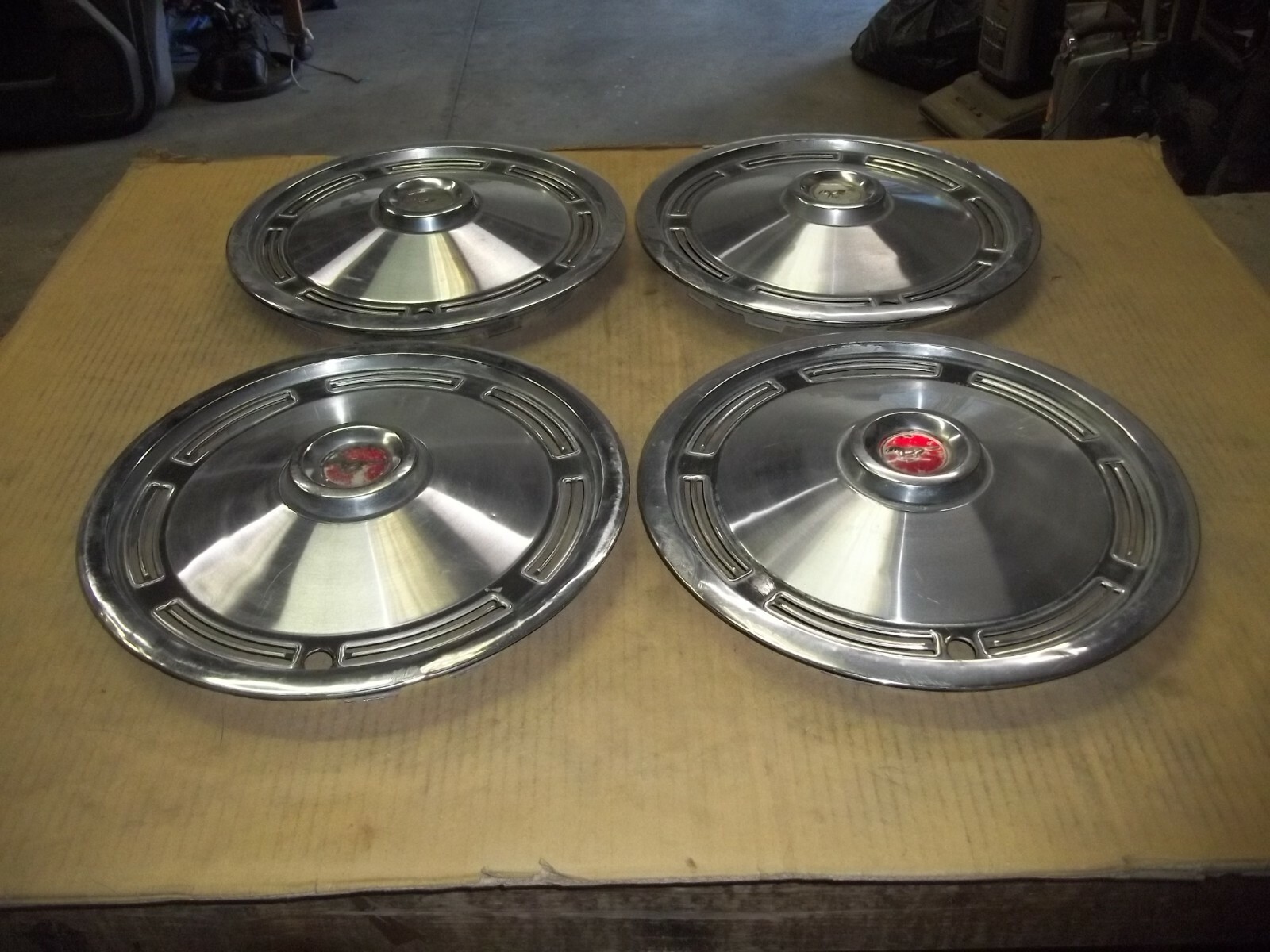 A set of FOUR (4) 1974 Ford Mustang 13" factory full wheel covers.This is a VERY used set with MANY large dings / dents and deep scratches / scrapes.These dings / dents and scratches / scrapes will be noticeable from even a short distance.Entire outer edges have heavy curb damage.Flat center sections dinged and dented uneven with heavy curb damage.The original finish is VERY faded and worn due to time.Oxidation and corrosion.Staining that does not polish out.Paint worn off.Plastic center emblems peeling and lost all color.Centers loose and rattle.Slightly bent out of round when laid flat but attach to wheels as designed.Poor driver car quality or only better than none at all.On a scale from 1 to 10, these rate a "5" or less in condition.Buyer to pay shipping with a flat rate of $20 within the continental U.S..Elsewhere there are additional charges.Accept most methods of payment.California buyer to pay state sales tax.