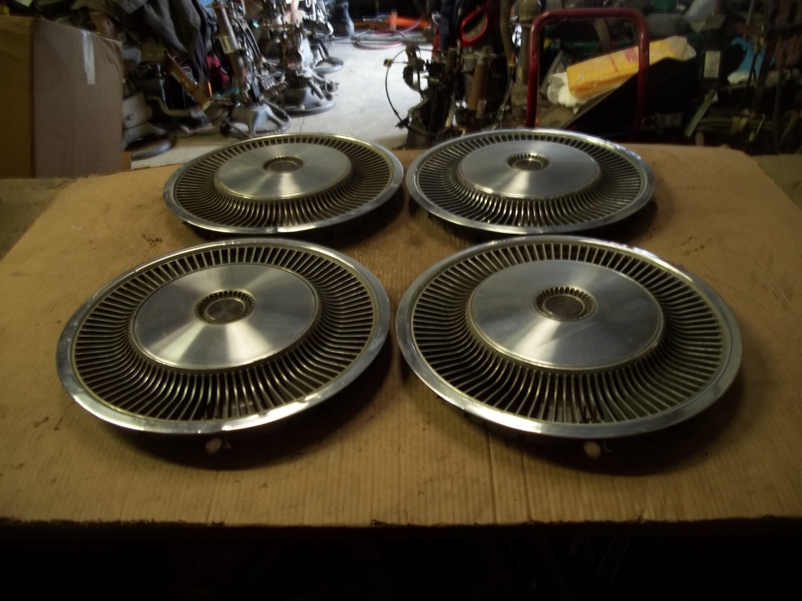A set of FOUR (4) 76-80 Dodge Aspen and 76-80 Plymouth Volare 14" factory full wheel covers.Covers are style WITHOUT rectangular vent holes on rear making them unable to be seen through.This is a VERY used set with MANY large dings / dents and deep scratches / scrapes.These dings / dents and scratches / scrapes will be noticeable from even a short distance.Outer edges curb damaged with dings and dents.Flat center sections dented.The original finish is VERY faded and worn due to time.Oxidation and corrosion.Staining that does not polish away.Paint worn.Pitting on fins.Plastic fins are slightly loose.One cover has two screws used on back to attach fin section secure.Poor driver car quality.On a scale from 1 to 10, these rate a "5" in condition.Buyer to pay shipping with a flat rate of $25 within the continental U.S..Elsewhere there are additional charges.Accept most methods of payment.California buyer to pay state sales tax.