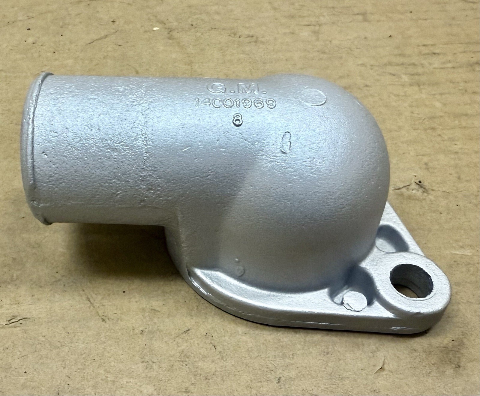 **For sale is a used Thermostat Housing suitable for various 1979-1984 Chevrolet and GMC Trucks and Vans. The aluminum housing is in good condition, having undergone a media blast and been painted in a matte silver finish. There is some pitting on the outlet neck where the hose mounts. The casting number on the housing is 14001969.**