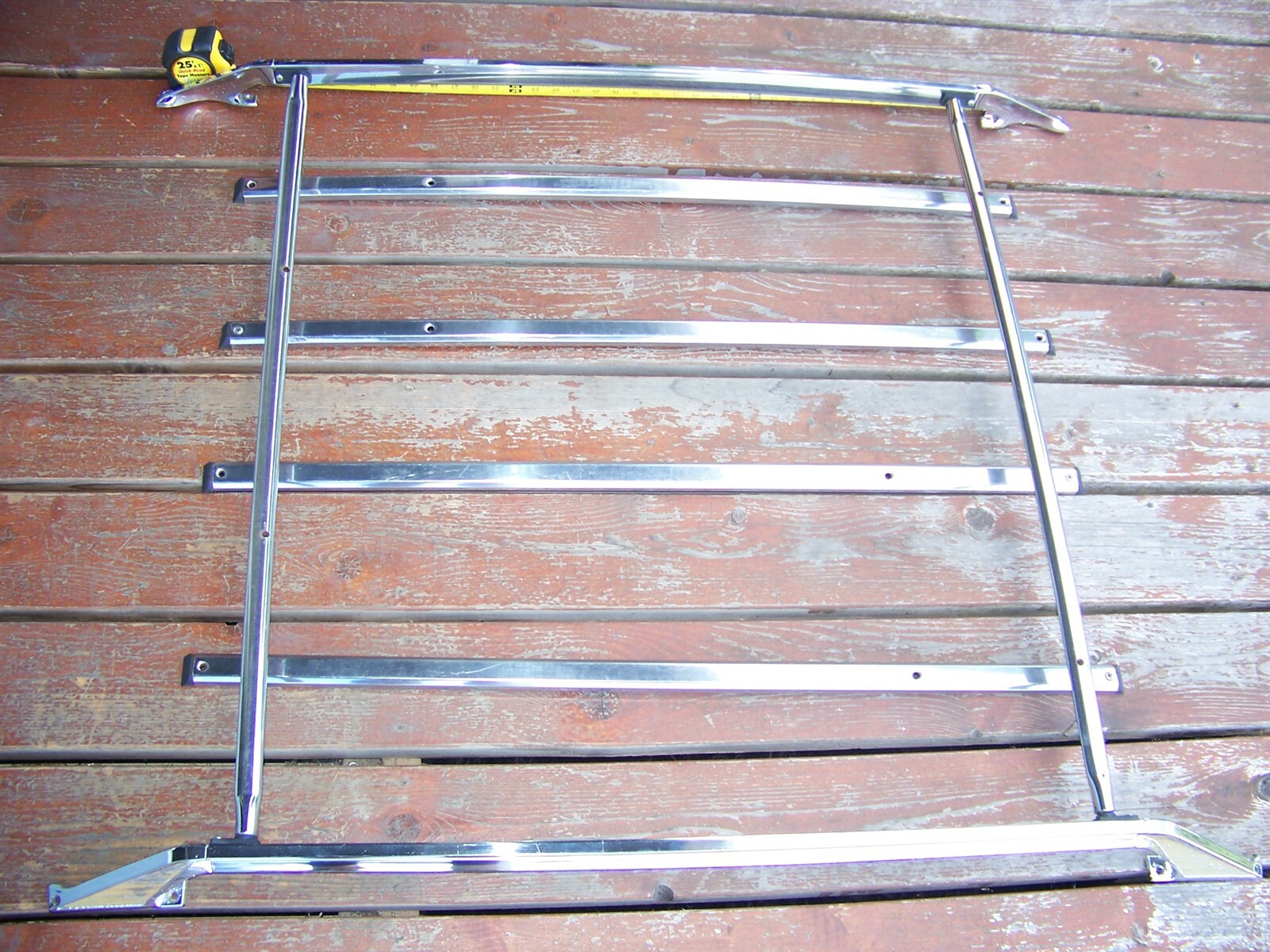 This was removed from a 1979 Datsun 210 wagon. The chrome pedestals have a lot of pitting and the woodgrain is faded/worn. These mount just under 37" apart at the inside screw holes and 45" apart at the outside screw holes. The side rails have faded/worn woodgrain and typical scuffs and scratches. The 2 chrome bars have peppering and imperfections. The 4 stainless bars have scuffs. Overall measures just under 38 1/2" side to side (width). The only hardware I have for this is the four black brackets pictured. Please use the zoom feature to closely inspect pictures. My items are sold as-is, there are no returns. Descriptions, pictures and part numbers (when available) are provided. You are responsible for ensuring that it is correct for your application or purpose. I will ship using your UPS/FedEx shipping account if desired. If you are an international buyer and wish to purchase multiple items, please contact us BEFORE you purchase (include item numbers) for possible shipping discounts. Thank you for looking! 82020  Powered by SixBit's eCommerce Solution