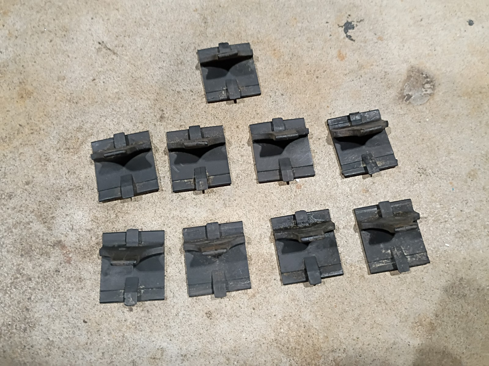 Good used condition lower windshield trim mounting clips for 1980-1996 Ford trucks and Broncos. F150 F250 F350 These hold the lower exterior stainless trim to the body. This is a complete set of 9 clips needed to hold trim on. Last photo is of a piece of trim with the clips on it for reference. Trim not included!