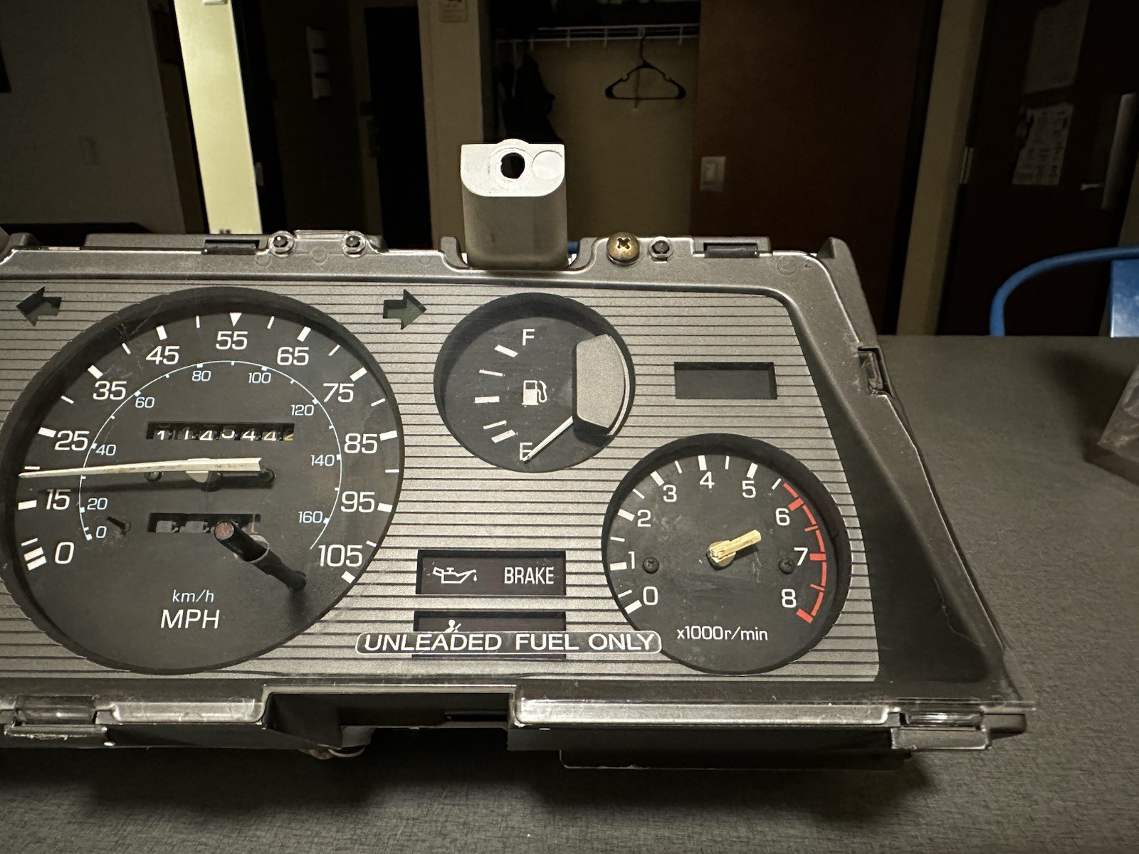 Instrument cluster from 1983-1986 Nissan 720 Pickup. Swapped the clock from it for a blank, hence the hole in the acrylic cover.