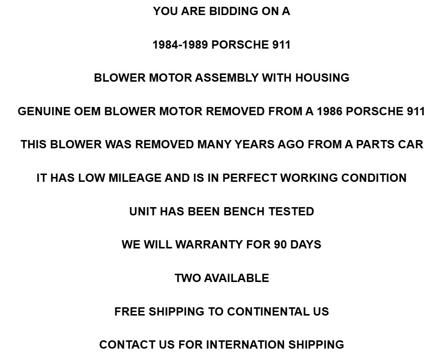 <font rwr="1" style="font-family: Arial; font-size: 14pt;"><font rwr="1" style="font-family: Arial;"><font rwr="1" style="font-family: Arial;"><font rwr="1" style="font-family: Arial;"><font rwr="1" style="font-family: Arial;"><font rwr="1" style="font-family: Arial;"><font rwr="1" style="font-family: Arial;"><font rwr="1" style="font-family: Arial;"><blockquote style="margin-right: 0px;" dir="ltr"> <blockquote style="margin-right: 0px;" dir="ltr"> <blockquote style="margin-right: 0px;" dir="ltr"> <blockquote style="margin-right: 0px;" dir="ltr"> <blockquote style="font-size: 14pt; margin-right: 0px;" dir="ltr"> <blockquote style="MARGIN-RIGHT: 0px" dir="ltr"> <blockquote style="MARGIN-RIGHT: 0px" dir="ltr"> <blockquote style="MARGIN-RIGHT: 0px" dir="ltr"> <p><strong></strong> </p></blockquote></blockquote></blockquote></blockquote></blockquote></blockquote></blockquote></blockquote></font></font></font></font></font></font></font></font><font face="Arial" size="6"><font rwr="1" style=""><font rwr="1" style=""><font rwr="1" style=""><font rwr="1" style=""><font rwr="1" style=""><font rwr="1" style=""><font rwr="1" style=""><font rwr="1" style=""><p style=""><i style="font-weight: bold;"></i></p><div style="text-align: center;"><i style="font-weight: bold;"><i style=""><font style=""><strong style=""><font style=""><font style=""><i style=""><font style=""><strong style=""><font style=""><font style=""><font style=""><font style=""><u style=""><b style=""><font style=""><font style="">LANSDOWNE MOTORSPORT</font></font></b></u></font></font></font></font></strong></font></i></font></font></strong></font></i></i></div><div style="font-weight: bold; font-style: italic; text-align: center;"><i><strong><font style=""><i><strong><u><b>160 E. PLUMSTEAD AVE, LANSDOWNE PA 19050</b></u></strong></i></font></strong></i></div><div style="font-weight: bold; font-style: italic; text-align: center;"><strong><br></strong></div><div style="font-weight: bold; text-align: center;"><strong style="">YOU ARE BIDDING ON A</strong></div><div style="font-weight: bold; text-align: center;"><b><br></b></div><div style="font-weight: bold; text-align: center;"><b>1984-1989 PORSCHE 911</b></div><div style="font-weight: bold; text-align: center;"><b><br></b></div><div style="font-weight: bold; text-align: center;"><b style="">BLOWER MOTOR ASSEMBLY WITH HOUSING</b></div><div style="font-weight: bold; text-align: center;"><b><br></b></div><div style="text-align: center;"><b>GENUINE OEM BLOWER MOTOR REMOVED FROM A 1986 PORSCHE 911</b></div><div style="text-align: center;"><b><br></b></div><div style="text-align: center;"><b>THIS BLOWER WAS REMOVED MANY YEARS AGO FROM A PARTS CAR</b></div><div style="text-align: center;"><b><br></b></div><div style="text-align: center;"><b>IT HAS LOW MILEAGE AND IS IN PERFECT WORKING CONDITION</b></div><div style="text-align: center;"><b><br></b></div><div style="text-align: center;"><b>UNIT HAS BEEN BENCH TESTED</b></div><div style="text-align: center;"><b><br></b></div><div style="text-align: center;"><b>WE WILL WARRANTY FOR 90 DAYS</b></div><div style="text-align: center;"><b><br></b></div><div style="text-align: center;"><b>TWO AVAILABLE</b></div><div style="font-weight: bold; text-align: center;"><b><br></b></div><div style="font-weight: bold; text-align: center;"><b>FREE SHIPPING TO CONTINENTAL US</b></div><div style="font-weight: bold; text-align: center;"><b><br></b></div><div style="font-weight: bold; text-align: center;"><b>CONTACT US FOR INTERNATION SHIPPING</b></div></font></font></font></font></font></font></font></font></font><font rwr="1" style=""><font rwr="1" style=""><font rwr="1" style=""><font rwr="1" style=""><font rwr="1" style=""><font rwr="1" style=""><font rwr="1" style=""><font rwr="1" style=""><blockquote style="margin-right: 0px;" dir="ltr"><blockquote style="margin-right: 0px;" dir="ltr"><blockquote style="margin-right: 0px;" dir="ltr"><br><blockquote style="font-size: 14pt; margin-right: 0px;" dir="ltr"><font size="5"><strong></strong></font></blockquote></blockquote></blockquote></blockquote></font></font></font></font></font></font></font></font>
