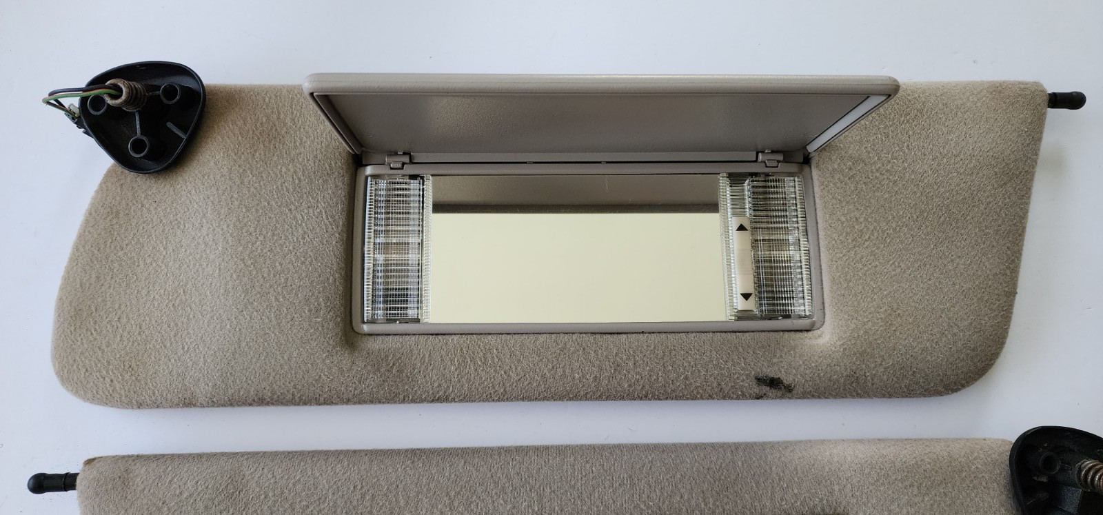 For 1984-2001 Jeep XJ, body style shown in last picture Sold as a pair, Driver and Passenger sides Features: Mirrors, Lights 2 wire connector for lights Color : Gray Visors are used and shows signs of wear for their age, including stains and holes in fabric Please View All Pictures Before Purchase