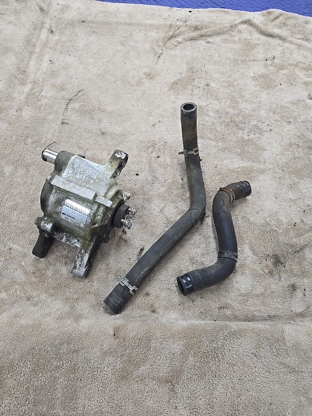 Smog pump off of a 87 22R part number 17610 - 35020. I'm posting this as for parts and as a core because it's had water in it. And I can tell by the rust inside the tubes. Sticking out of the back of the pump.