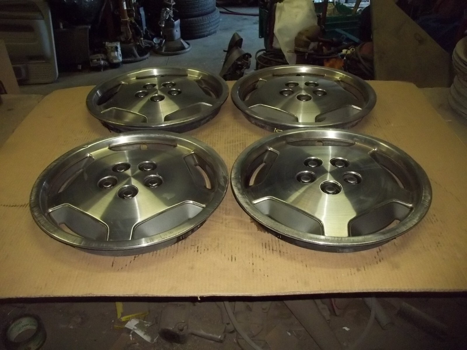 A set of FOUR (4) 1989 Chrysler Le Baron 15" factory full wheel covers.This is a VERY used set with MANY large dings / dents and deep scratches / scrapes.These dings / dents and scratches / scrapes will be noticeable from even a short distance.Entire faces and edges curb damaged.The original finish is VERY faded and worn due to time.Oxidation and corrosion.Staining that does not polish off.Brightness or shine different shades.Paint completely worn off and different colors.Slightly bent out of round when laid flat but attach to wheels as designed.Mounting clips in good working order.Poor driver car quality.On a scale from 1 to 10, these rate a "5" or less in condition.Buyer to pay shipping with a flat rate of $25 within the continental U.S..Elsewhere there are additional charges.Accept most methods of payment.California buyer to pay state sales tax.