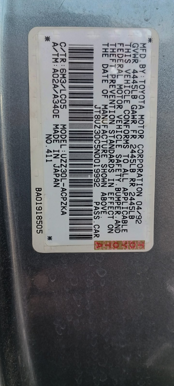 - VIN #: JT8UZ30C8S0045644
