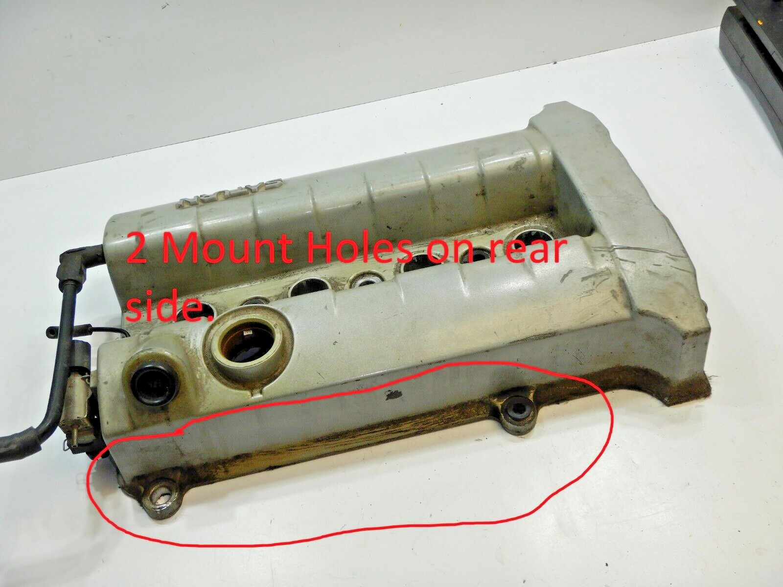 Please look at the pictures before you buy it, it may not fit your car. **There are only 3 mounting holes in the spark plug galley, not 4.** **The rear edge of the cover has 2 mounting holes, not 3.** Fits 1993 to 1998 Saturn SW2, SL2, SC2. Dual over head cam models only. Great condition, dirty & will need to be cleaned. Has some scratches. The valve cover is Dirty and will need to be cleaned. Included is the mounting bolts that are pictured. **The pictures with red in them are not the valve cover you are buying.** Location: Top shelf.