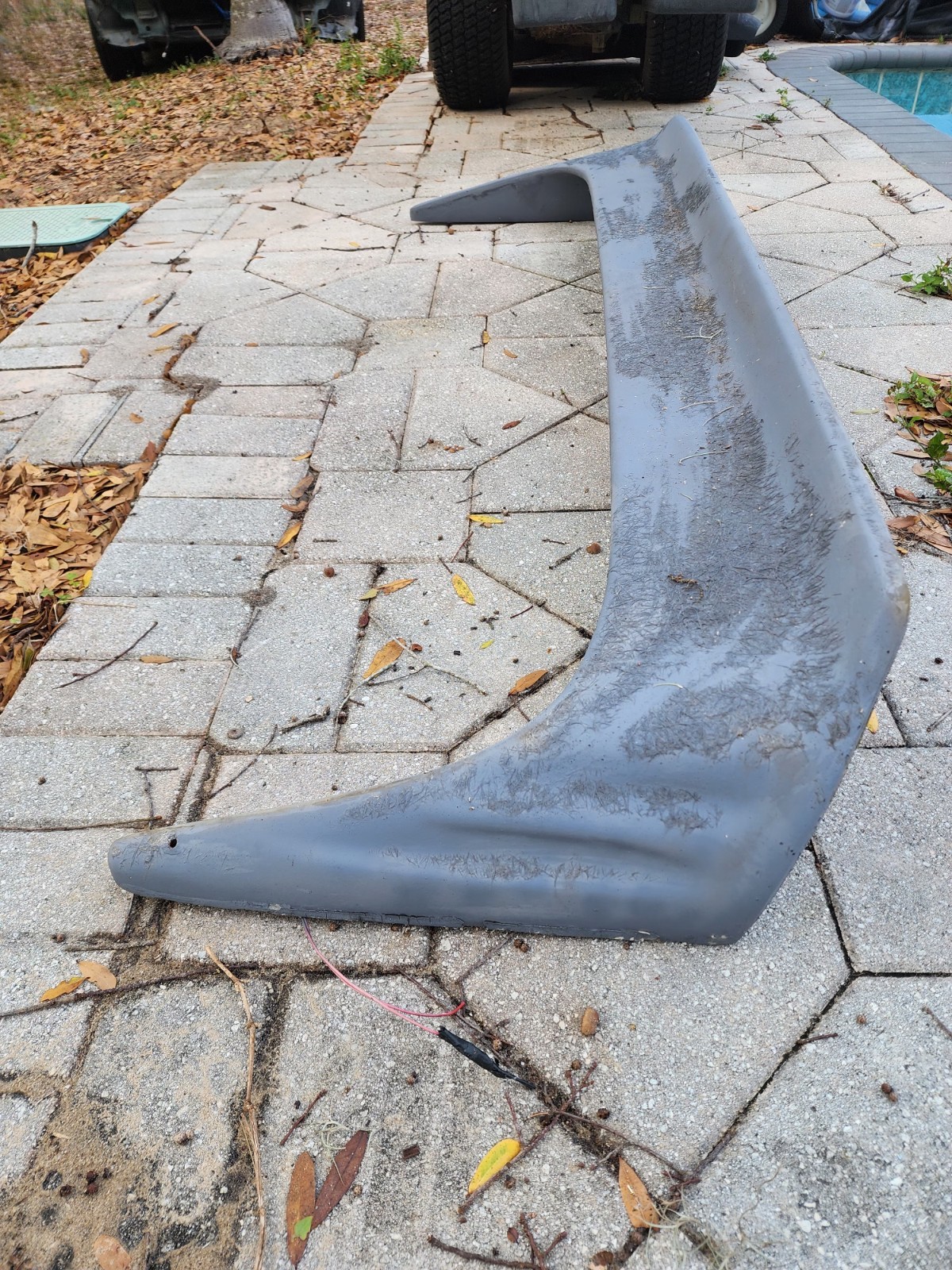 1994-2002 dodge ram 1500 fiberglass rear bed spoiler has fiberglass fibers showing has light primer comes wired in for 3rd brake like on spoiler has mounting points 2 studs are broken could be repaired. texas tail for dodge ram as-is. no returns