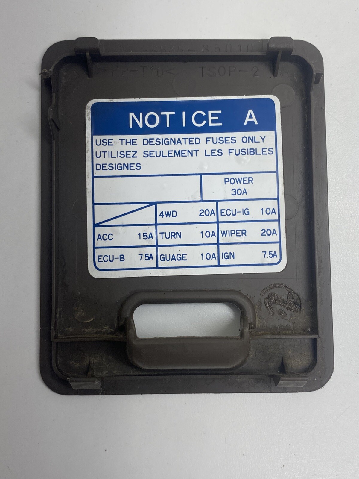 Up for purchase is a USED OEM fuse cover for SOME 96-02 Toytota 4Runner vehicles. Faceplate is OAK BROWN in color. In good, used condition with no cracks or breaks, but it DOES have some wear from previous use. Could use a once over if you are particular, but it has been cleaned to a usable level. **They used a few different fuse layouts during these years, so please make sure the layout matches what is listed in your fuse box.** This one has a BLUE NOTICE A layout sticker on it, some had a red sticker. Also CHECK THE AMP markings as some of them are in the same location, but with different amperages. Please ask questions prior to purchase. **\*To prevent fraud, this item is stamped with a custom made heat stamp that melts a mark into an unseen portion of the part to prove that the part came from me. Returns for items damaged during shipping MUST bear this logo or else the claim will be dismissed. Any alteration to the marking will also cause the dismissal of a damage return. If you have any questions about this, please contact me prior to purchase.**