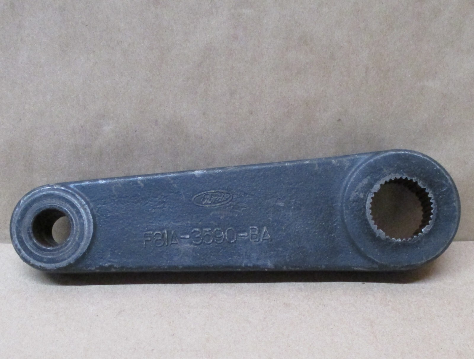 **FOR SALE:** **PULL OFF OEM FORD PITMAN ARM** **PICTURES ARE OF THE EXACT PART YOU ARE PURCHASING** **PLEASE LOOK CAREFULLY AND ASK ALL QUESTIONS PRIOR TO PURCHASE** **PART#** **F81A-3590-BA** **32 SPLINE** **PLEASEREFER TO THE CHART FOR YOUR CORRECT VEHICLE APPLICATION** **\*\*\*IT'S THE BUYERS RESPONSIBILITY TO MATCH YOUR PART NUMBER TO ENSURE PROPER FITMENT\*\*\*** **ALL BIDDERS PLEASE READ THE FOLLOWING CAREFULLY** SHIPPING PRICE BASED ON LOWER 48 UNITED STATES ONLY Please contact us for cost of shipping outside the lower 48 **WARRANTY INFORMATION** **WARRANTY – 30 DAYS FROM DATE OF PURCHASE** **WE WILL CHARGE A 20% RESTOCKING FEE ON RETURNED ITEMS** **RETURN SHIPPING COST IS THE RESPONSIBILITY OF THE BUYER** If there is any problem with this item, please let us know immediately and give us a chance to address the situation before leaving negative feedback. We strive for 100% positive feedback with every transaction. We are willing to work out any dispute that may come up with an item purchased from us. Contact us, we will make it right! Though very unlikely, in the case where a part is faulty, we will gladly replace the part if one is available.
