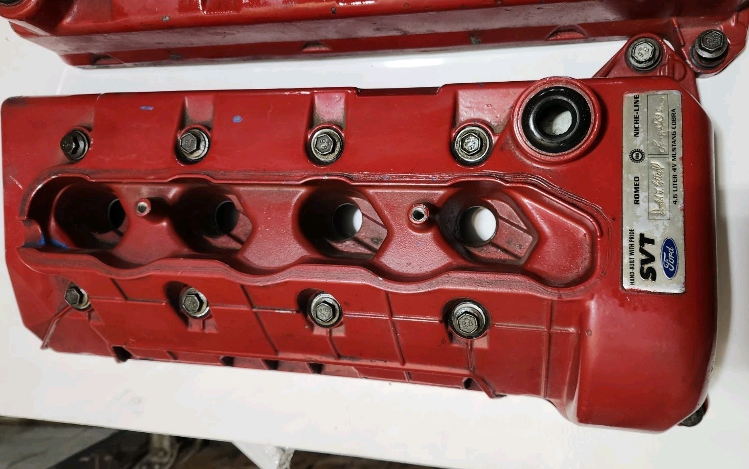 Set of painted used valve covers off of a 1999 or 2001 Cobra. Damage to one of the coil cover fastener mounts is shown in the pictures.