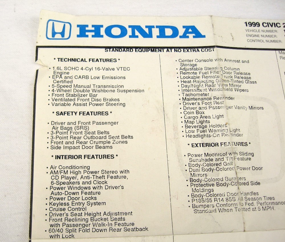#### 1999 HONDA CIVIC ORIGINAL WINDOW STICKER Original Honda Civic EX 2-door original window sticker. This is the real deal and made for 1999 Honda 1.6L VTEC engine with 5-Speed transmission. It has some wear, otherwise a nice original. **Condition:** Used **Application(s):** - 1999 Honda Civic. **Payment:** - FREE USPS Ground Advantage anywhere in the U.S. - Payment is Due in 5 days. by SixBit](https://www.sixbitsoftware.com/images/tagline.jpg) Powered by SixBit's eCommerce Solution