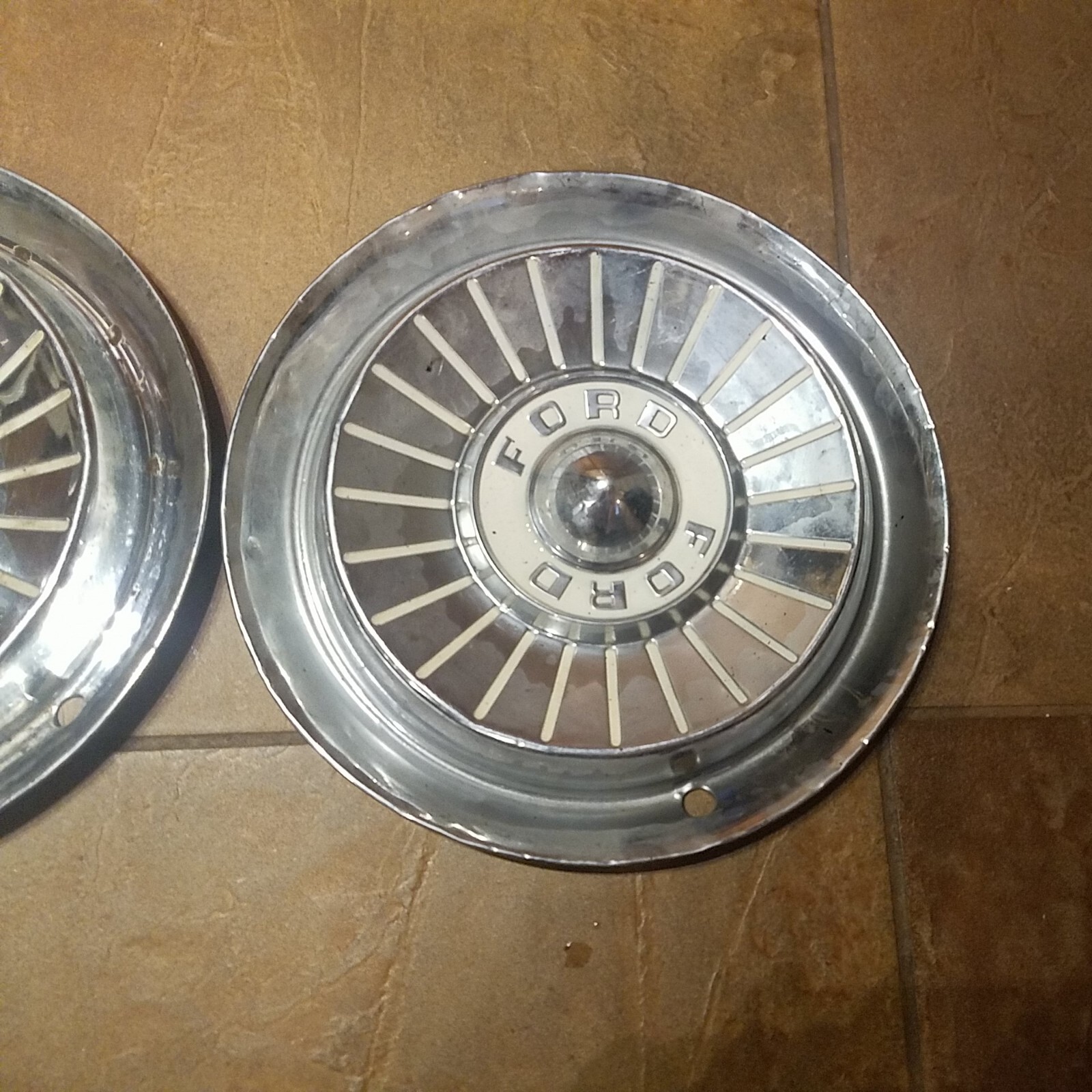 2- 1955-57 Ford Fairlane Or Thunderbird 14 In Hubcaps OEM Items. These are original hubcaps that have been in a restorer's garage for a long time. They both have a few dings and marks, but generally are in good, usable condition. Both are dirty in spots with what appears to be Road Grime or tar residue. Both would clean up very well.