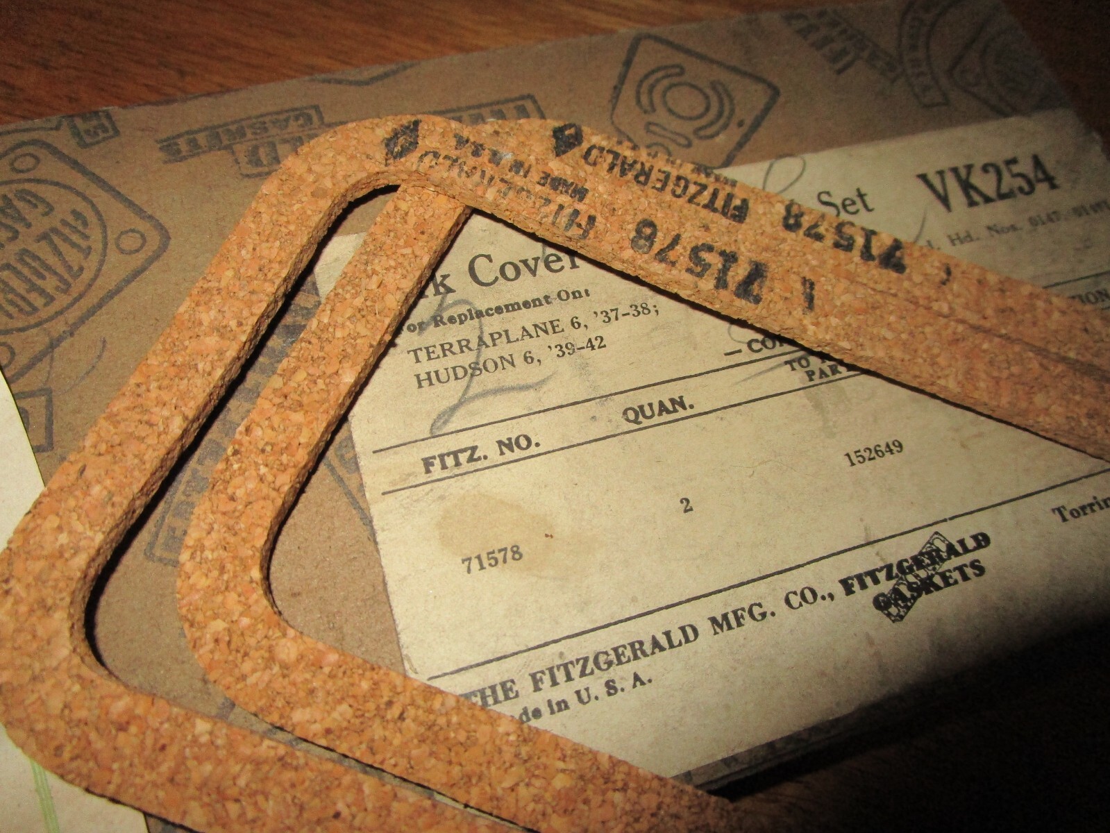 Up for Buy-It-Now is a new old replacement stock box of 2 valve cover gaskets, Fitzgerald part number VSVK254. According to my Victor Manual, these are used on the following models and years: 1937-1938 Terraplane...6 cylinder 1939-1942 Hudson..6 cylinder The gaskets are in brand new, never used condition and are free of any damage. The original box is in fair condition. Please feel free to E-mail me questions. International bidders are always welcome. Thanks for looking!!!