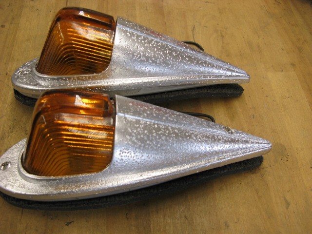 2 Vintage Griffin 117 Rat Rod cab marker lights with new light socket repair kits new 12 volt bulbs and Amber glass lens. Chrome painted top cover with pits in the aluminum. This is for 2 at $120.00 and free shipping If you have cab lights or parts of lights to sell or trade. Contact us and send photos of them. Then I can send you a offer. I have 200 or more listing for vintage lights in my store.