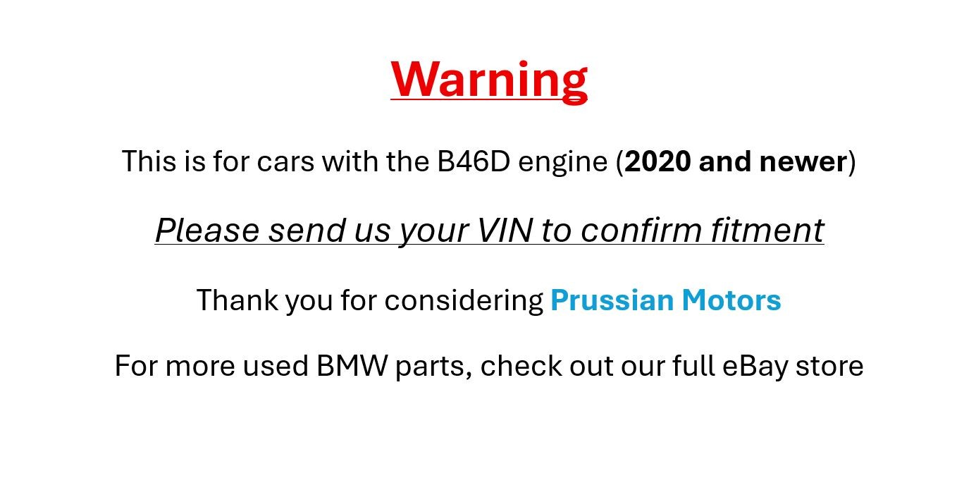 Please send us your VIN to confirm fitment. The integrated heat exchanger (oil cooler) is included as shown. Guaranteed good working condition. This is a used original BMW part. **Please note that the pictures are stock photos** * * * **FITS:** **2 Series G42** 2022 - 2023 230i Coupe (G42/B46) 2023 - 2023 230iX Coupe (G42/B46) **3 Series G20** 2019 - 2022 330i Sedan (G20/B46) 2019 - 2022 330iX Sedan (G20/B46) **3 Series G20N** 2023 - 2025 330i Sedan (G20N/B46) 2023 - 2025 330iX Sedan (G20N/B46) **4 Series G22** 2021 - 2023 430i Coupe (G22/B46) 2021 - 2024 430iX Coupe (G22/B46) **4 Series G22N** 2025 - 2025 430i Coupe (G22N/B46) 2025 - 2025 430iX Coupe (G22N/B46) **4 Series G23** 2021 - 2023 430i Convertible (G23/B46) 2022 - 2023 430iX Convertible (G23/B46) **4 Series G23N** 2025 - 2025 430i Convertible (G23N/B46) 2025 - 2025 430iX Convertible (G23N/B46) **4 Series G26** 2021 - 2024 430i Gran Coupe (G26/B46) 2021 - 2024 430ix Gran Coupe (G26/B46) **4 Series G26N** 2025 - 2025 430i Gran Coupe (G26N/B46) 2025 - 2025 430iX Gran Coupe (G26N/B46) **5 Series G30** 2018 - 2020 530e Sedan (G30/B46x) 2018 - 2020 530eX Sedan (G30/B46x) 2017 - 2020 530i Sedan (G30/B46) 2017 - 2020 530iX Sedan (G30/B46) **5 Series G30N** 2021 - 2023 530e Sedan (G30N/B46x) 2021 - 2023 530eX Sedan (G30N/B46x) 2021 - 2023 530i Sedan (G30N/B46) 2021 - 2023 530iX Sedan (G30N/B46) **X3 G01** 2020 - 2020 X3 30eX SAV (G01/B46x) 2018 - 2020 X3 30i SAV (G01/B46) 2018 - 2020 X3 30iX SAV (G01/B46) **X3 G01N** 2021 - 2024 X3 30eX SAV (G01N/B46x) 2021 - 2024 X3 30i SAV (G01N/B46) 2021 - 2024 X3 30iX SAV (G01N/B46) **X4 G02** 2019 - 2020 X4 30iX SAV (G02/B46) **X4 G02N** 2021 - 2023 X4 30iX SAV (G02N/B46) **Z4 G29** 2019 - 2022 Z4 30i Roadster (G29/B46) * * * **OUR STORE POLICIES:** **Returns:** Items can be returned within 30 days for any reason (No Large International Returns). Items must be returned in the same condition as received. All returns must be packaged well with similar protective materials to the original packaging. Items damaged during return shipping will face up to a 50% reduction in refunded amount. Customers who return a different item than the one we sent will be reported to police and blocked from making future purchases. **Warranty:** All parts are guaranteed as described and working for 30 days, unless they are stated AS-IS condition. Warranty does not cover labor costs. Defective parts for a refund of your purchase price + shipping. We strongly discourage using BMW dealerships for service using our parts. Please find a reputable German Specialty Repair Facility. **Guarantee:** If we verify compatibility using your vehicle VIN number we guarantee proper fitment. If for any reason your purchase does not fit you will be refunded 100% of your purchase price and we will provide a return shipping label at no cost to you. Labor costs will not be reimbursed. **Shipping:** We will ship your item the same or next business day after receiving cleared payment. If payment is received before 12pm Eastern Time, your part will ship out the same day. Rarely, large or difficult to package items will take a day or two longer. UPS Ground shipments are sent WITHOUT signature required. Local pickup at our garage in Norristown, PA zip code 19401 is always welcome. **International Buyers:** Import duties, taxes, and charges are not included in the item price or shipping cost. These charges are the buyer's responsibility. Large items can not be returned once shipped out of the country. * * * **FITMENT FAQ:** **Which side does this part fit?** Left = Driver side, Right = Passenger side Reference to driver/passenger side is for left hand drive cars, so for RHD vehicles (UK/Japan/Australia, etc.) please reverse the side indicated. **What does the production month mean?** When the fitment information includes a production month this means the part will only fit some of the cars within a given model year, depending on what month the car was manufactured. Production for the "model year" usually begins in September of the previous calendar year, so if you have a 1995 model BMW it will have been produced anywhere between 9/94 - 8/95. Some cars begin their production earlier than September, such as the first year production for a new model. For example, if we say the part fits 04/95 - 99 it will fit those cars with a production date of April 1995 to 1999 model year cars. Or if we say the part fits 99 - 05/99 it will fit 1999 model year vehicles and up to and including those with a production date of 04/99. **Where do I find my car's production month?** The production month for your vehicle can be found on a sticker located on your front driver side door jamb. See the photo below for illustration:  **Will this part fit my non-US market BMW?** Fitment information provided is for US market spec vehicles only. **Are Your Airbags Recall Compliant?** I certify this airbag is not subject to recall and will be shipped in accordance with hazmat shipping requirements. **Still not sure this part will fit your car?