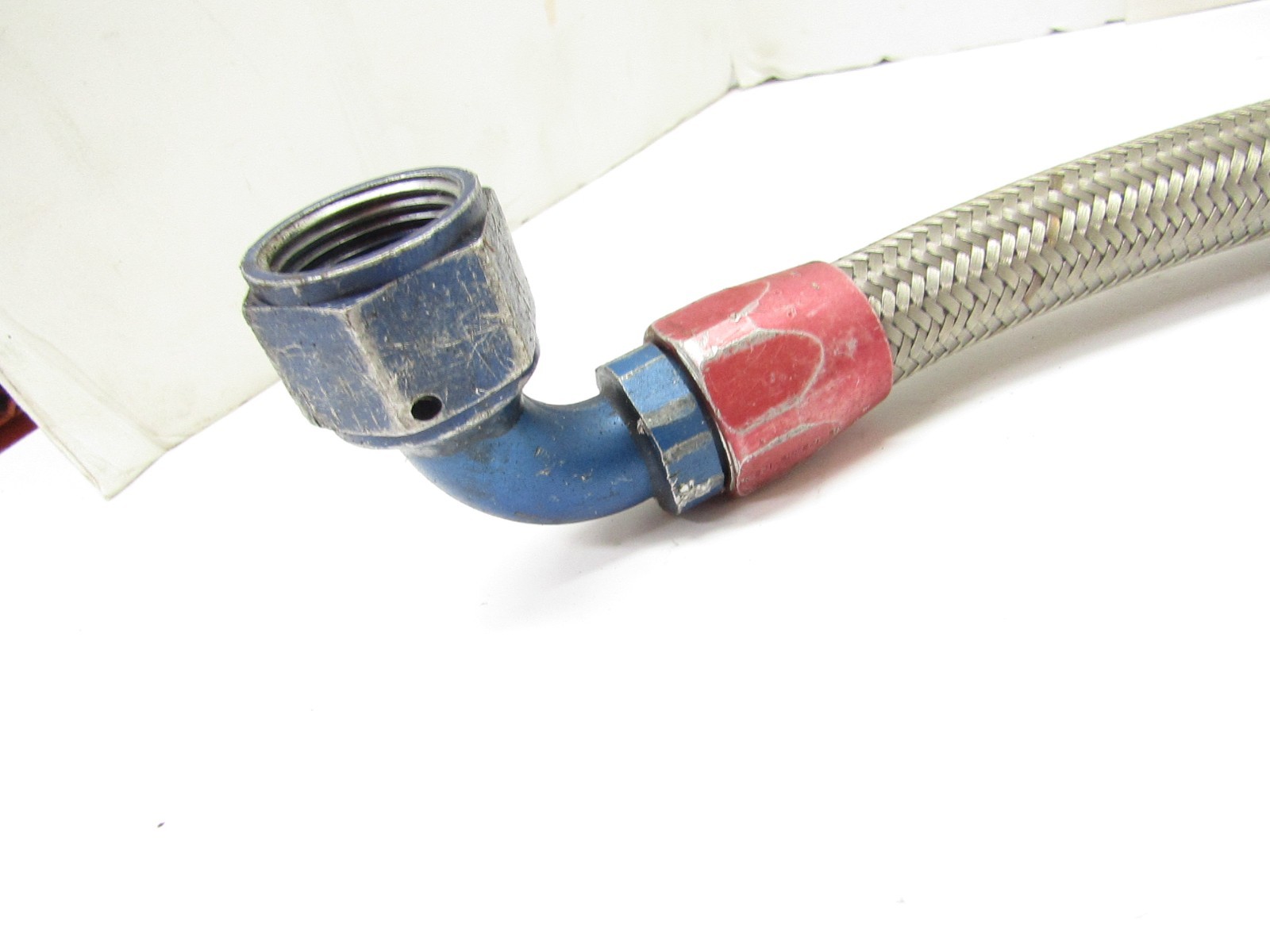Here is a used 20" stainless steel braided hose with -12 An Aeroquip 45 degree swivel and a -12 an Aeroquip 90 degree non swivel reusable fittings. We do combine shipping on multiple items.