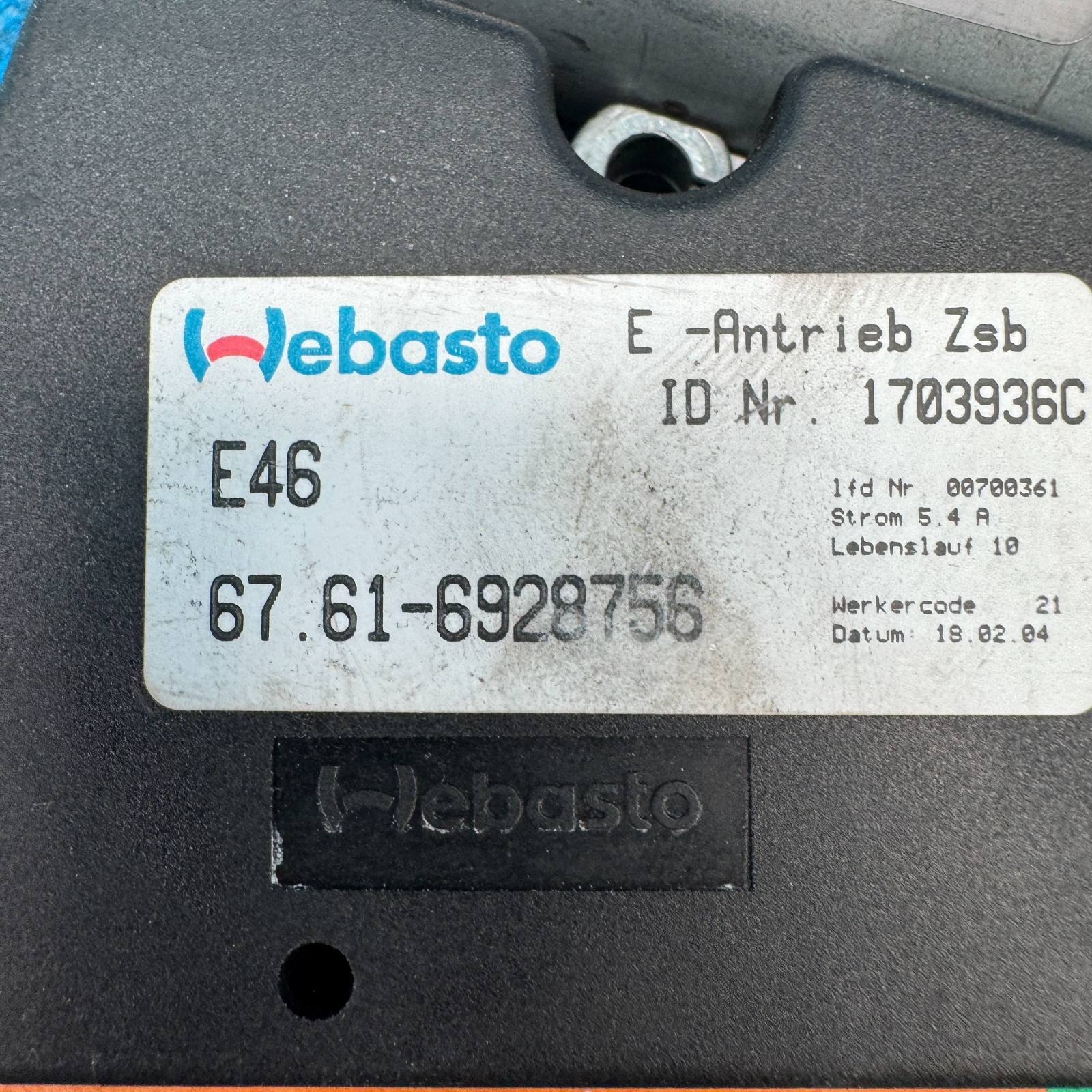 2001–2006 BMW 330i E46 Sedan Sunroof Motor Module OEM 67616928756 Genuine OEM sunroof motor module (Webasto) for BMW 330i E46 Sedan. Markings: 67.61-6928756 / Webasto E-Antrieb Zsb ID Nr. 1703936C / Valeo 404395 12V / 1W02-A-3200A-A. OEM: 67616928756 Used part in good condition. No cracks or visible damage. Please review photos carefully. COMPATIBILITY: \- 2001 BMW 330i E46 Sedan \- 2002 BMW 330i E46 Sedan \- 2003 BMW 330i E46 Sedan \- 2004 BMW 330i E46 Sedan \- 2005 BMW 330i E46 Sedan \- 2006 BMW 330i E46 Sedan DONOR VEHICLE: \- Model: BMW 330i (E46) Sedan \- VIN: WBAEV53444KM06759 \- Production Date: 2004-03 \- Engine: 3.0L M54B30 \- Transmission: 6-Speed Manual \- Drive: RWD \- Steering: Left Hand Drive \- Manufacturer: Regensburg, Germany / BMW AG \- Market: USA