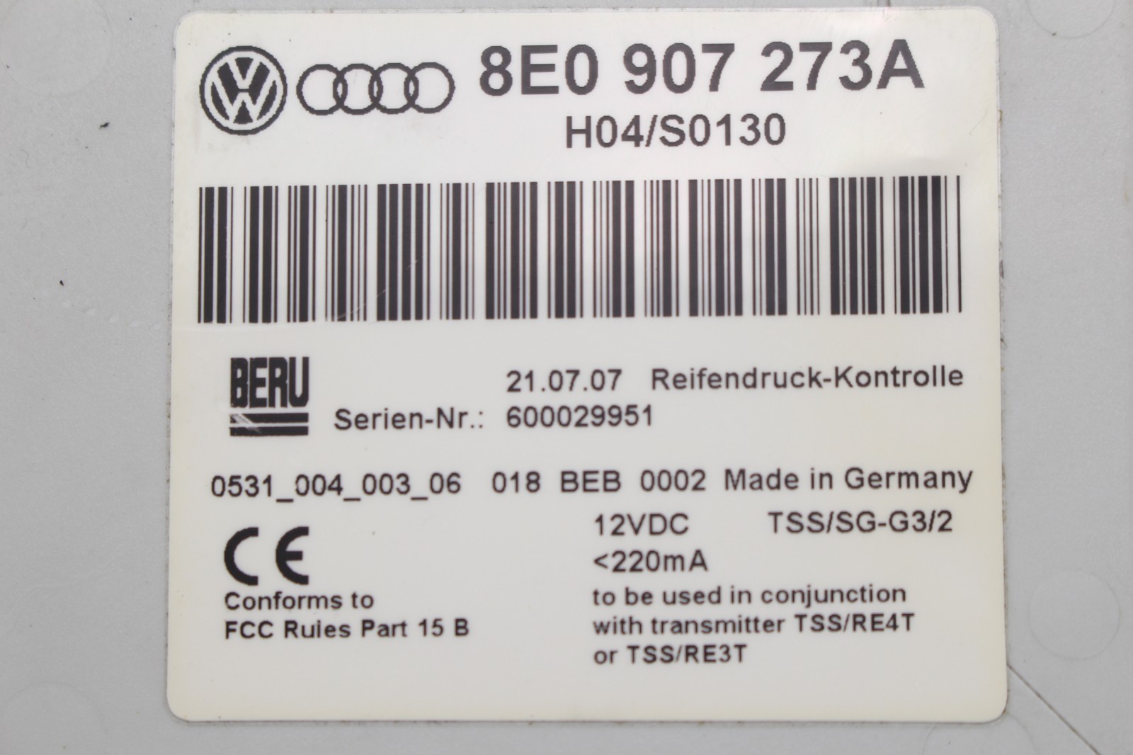 2002-2008 AUDI A4 TPMS TIRE PRESSURE MONITORING CONTROL MODULE OEM, 8E0 907 273A
