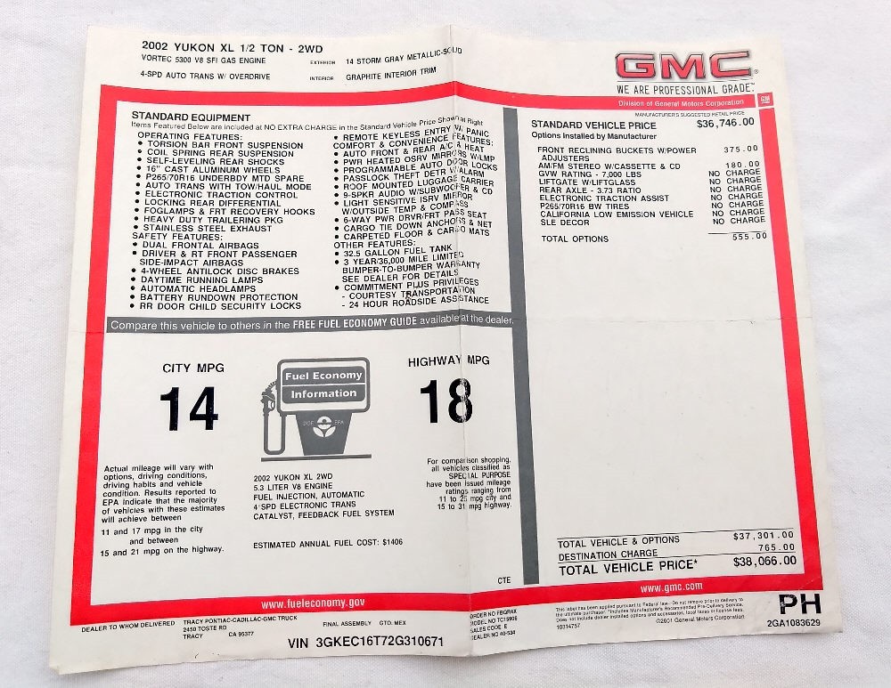 2002 GMC YUKON 5.3L 4-Speed A/T Genuine Original Monroney Window Sticker $38,066
