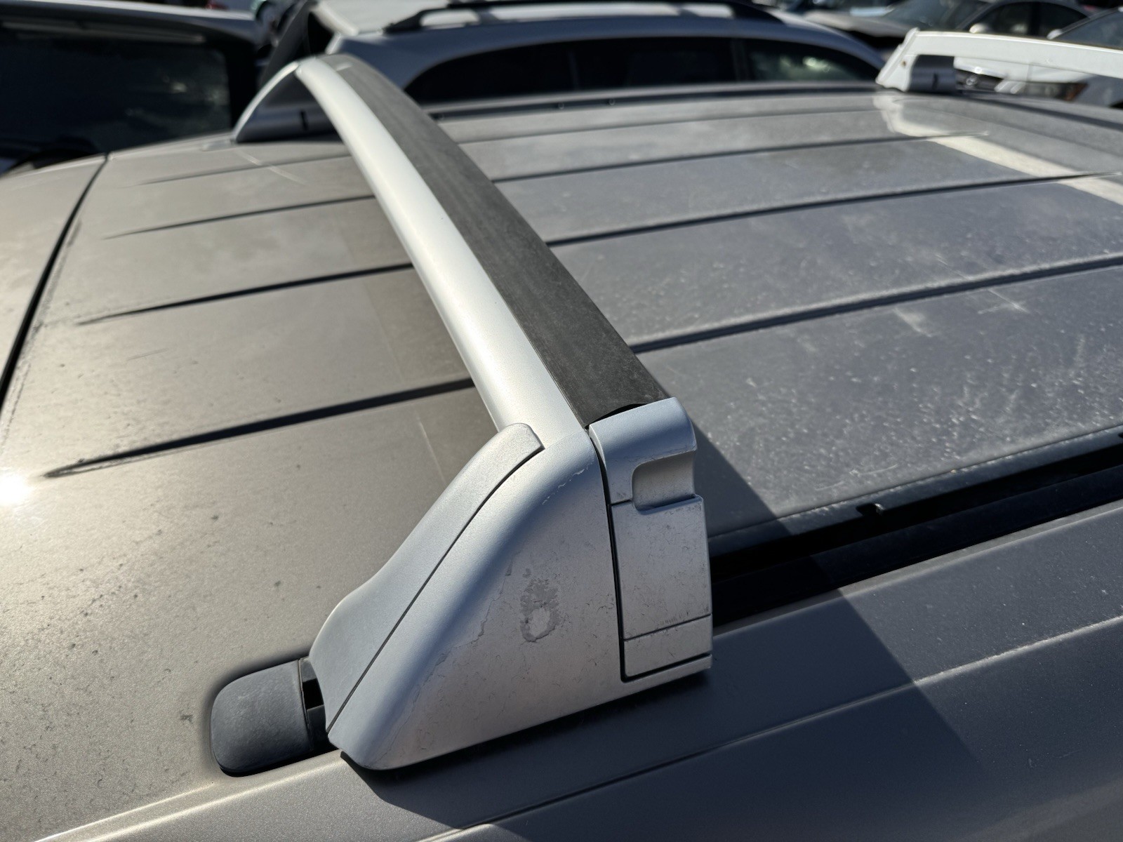 **Genuine VW roof rack cross bars for 2003-06 VW Touareg SUV's. PER ONE OF MY CUSTOMERS, THESE ALSO FIT THE PORSCHE CAYENNE UP TO 2006, BUT APPARENTLY ON THE CAYENNE YOU CANNOT PUSH THEM ALL THE WAY SO THAT THEY TOUCH, FORMING ONE SPOILER WHEN NOT IN USE; INSTEAD, ON THE CAYENNE, THEY REMAIN A LITTLE BIT APART. SEE PHOTOS OF THIS ACTUAL ITEM INSTALLED ON A PORSCHE CAYENNE! You must have those tracks shown in photos for these to work!** **YOU MUST HAVE THE FLAT SIDE RAILS INSTALLED FOR THESE TO ATTACH TO; THEY SLIDE INTO AN OPENING ON THE RAILS AND THEN YOU PUSH THEM TO THE POSITION YOU WANT. CONDITION PER PHOTOS. INCLUDES LOCKS AND KEY.** **RARE SILVER COLOR! SEE PHOTOS FOR CONDITION. Note some clear coat peel on paint. THESE ARE A USED PART; LOOK AT PHOTOS.**