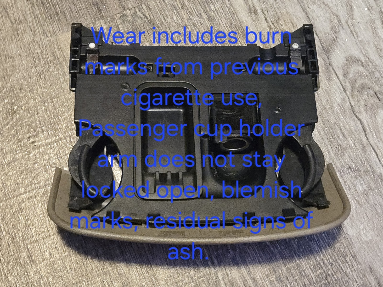 Years listed are suggested likely fit. Color match is not guaranteed. Unsure specific year range for the interior color code H. H is cross dark tan to brown in color and considered medium parchment. Check your vin tag in the driver door area and look at the second letter of the interior section. It should be H to match to this one. This had signs of smoke use prior to cleaning and overall looks decent after cleaning, but with residual staining and burn marks. Outlet worked upon testing, your charger may require some turning and manipulation to work, but it did work for me during testing and the spring feature worked. no lighter element included. this assembly functions as it should except that the passenger side cup holder arm does not stay locked out. Please match second letter "H" on the interior color code portion of your VIN tag to this for best results. Sold as is. Ships via USPS ground advantage or similar service. Seller Internal Inventory reference 0129PA26