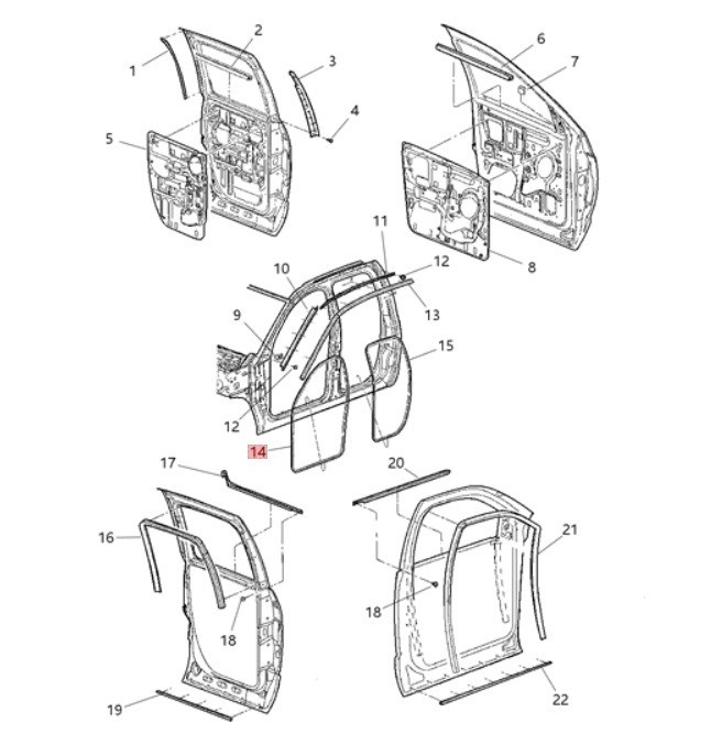 2003 - 2005 Dodge Ram 1500, 2500, 3500 Front Door on Body Weatherstrip Seal OEM 55275609AD, 55277294AA (Driver Side or Passenger side, same weatherstrip) Weatherstrip. This is a genuine OEM Dodge part, not the cheap aftermarket stuff. **\*\*Please note this weather strip / seal is for the vehicle body front door area, NOT the door itself, #14 on the diagram.**