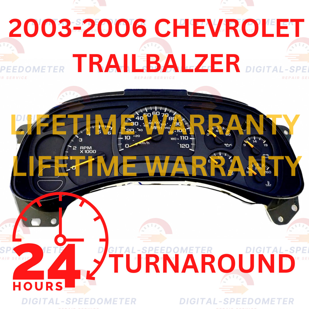 This is a **REPAIR SERVICE** to **YOUR****2003-2006 Chevrolet Trailblazer****Speedometer**. After the customer purchases the repair service, the customer will pay for shipping and send in **THEIR** unit to Digital Speedometer that Digital Speedometer will provide after purchase. As soon as we get your unit we have it fixed and sent out the same or next business day. **Again, this is a 24 hour turn around repair service.** **As soon as Digital Speedometer receives the customer's speedometer that they have shipped, Digital Speedometer will repair and ship back the fixed speedometer to the customer the same or next business day. If additional time is needed to repair the speedometer the customer will be notified. If the customer's speedometer can not be fixed, Digital Speedometer will refund the customer the service they purchased.** **Common questions people ask me:** 1\. Q: Can I drive my vehicle with cluster removed? A: Yes, your vehicle will operate normally without the cluster in there!! 2. Q: How long does the process take? A:The whole process takes about a week or less. I fix the cluster the day I get it and it will ship back out the next day (unless we run into some unknown problem).... 3. Q: Will my mileage change? A: Nope, your mileage is not affected; we repair yours and send yours back. 4. Q: Is my cluster difficult to remove? A: It will takes about 3-5 minutes, first engage the emergency brake, remove the plastic trim around the cluster, then with the steering wheel tilted down and the shifter in 1st gear pull the trim from the dash and it will unsnap and then put the trim off to the side. Next, remove the four 7mm screws holding the cluster in, gently pull out and disconnect the electrical plug from the back of the cluster. 5\. Q: How long is the warranty?? A: It is a LIFETIME WARRANTY and I stand behind my work 100%.
