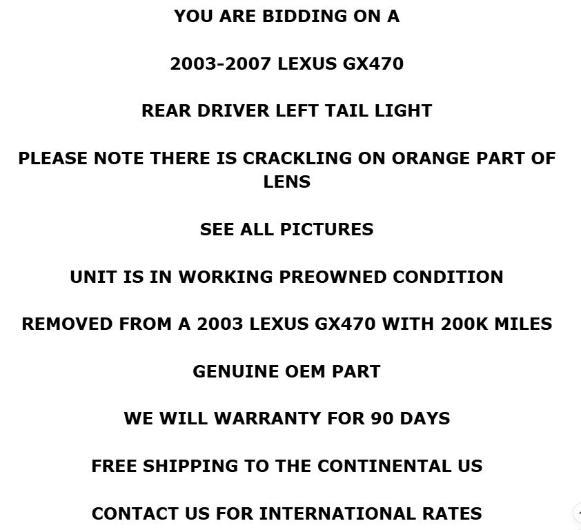 <html> <head> </head> <body > <font rwr="1" style=""><font rwr="1" style=""><font rwr="1" style=""><font rwr="1" style=""><blockquote dir="ltr" style="font-size: 14pt; font-family: Arial; margin-right: 0px;"> <blockquote dir="ltr" style="MARGIN-RIGHT: 0px"> <blockquote dir="ltr" style="MARGIN-RIGHT: 0px"> <blockquote dir="ltr" style="MARGIN-RIGHT: 0px"> <blockquote dir="ltr" style="MARGIN-RIGHT: 0px"> <blockquote dir="ltr" style="MARGIN-RIGHT: 0px"> <blockquote dir="ltr" style="MARGIN-RIGHT: 0px"> </blockquote></blockquote></blockquote></blockquote></blockquote></blockquote></blockquote><span style="font-size: 14pt; font-family: Arial; text-align: center;"> </span><span style="text-align: center;"><div style="font-family: Arial; font-size: 14pt; font-style: italic;"><i><font face="Verdana"><strong><font size="6"><font style="font-family: Arial;"><i><font face="Verdana"><strong><font size="6"><font size="4" style="font-family: Arial;"><font size="4"><font size="4"><u><b><font face="Verdana"><font size="6">LANSDOWNE MOTORSPORT</font></font></b></u></font></font></font></font></strong></font></i></font></font></strong></font></i></div><div style="font-family: Arial; font-size: 14pt; font-style: italic;"><i style="font-size: 14pt;"><font face="Verdana"><strong><font size="6"><font style="font-family: Arial;"><i><font face="Verdana"><strong><font size="6"><font size="4" style="font-family: Arial;"><font size="4"><font size="4"><u><b><font face="Verdana"><font size="6">160 E. PLUMSTEAD AVE, LANSDOWNE PA 19050</font></font></b></u></font></font></font></font></strong></font></i></font></font></strong></font></i></div><div style="font-family: Arial; font-size: 14pt; font-style: italic;"><i style="font-size: 14pt; font-family: Verdana;"><strong><font size="6"><br/></font></strong></i></div><div style="font-family: Arial; font-size: 14pt;"><span style="font-size: 14pt; font-family: Verdana;"><strong style=""><font size="6" style="">YOU ARE BIDDING ON A</font></strong></span></div><div style="font-family: Arial; font-size: 14pt;"><b style="font-family: Verdana; font-size: xx-large;"><br/></b></div><div style=""><font face="Verdana" size="6"><b>2003-2007 LEXUS GX470</b></font></div><div style=""><font face="Verdana" size="6"><b><br/></b></font></div><div style=""><font face="Verdana" size="6"><b>REAR DRIVER LEFT TAIL LIGHT</b></font></div><div style=""><b style="font-family: Verdana; font-size: xx-large;"><br/></b></div><div style=""><font face="Verdana" size="6"><b>PLEASE NOTE THERE IS CRACKLING ON ORANGE PART OF LENS</b></font></div><div style=""><font face="Verdana" size="6"><b><br/></b></font></div><div style=""><font face="Verdana" size="6"><b>SEE ALL PICTURES</b></font></div><div style=""><font face="Verdana" size="6"><b><br/></b></font></div><div style=""><font face="Verdana" size="6"><b>UNIT IS IN WORKING PREOWNED CONDITION</b></font></div><div style=""><font face="Verdana" size="6"><b><br/></b></font></div><div style=""><font face="Verdana" size="6"><b>REMOVED FROM A 2003 LEXUS GX470 WITH 200K MILES</b></font></div><div style=""><font face="Verdana" size="6"><b><br/></b></font></div><div style=""><font face="Verdana" size="6"><b>GENUINE OEM PART</b></font></div><div style=""><font face="Verdana" size="6"><b><br/></b></font></div><div style=""><font face="Verdana" size="6"><b>WE WILL WARRANTY FOR 90 DAYS</b></font></div><div style=""><b style="font-family: Verdana; font-size: xx-large;"><br/></b></div><div style=""><b style="font-family: Verdana; font-size: xx-large;">FREE SHIPPING TO THE CONTINENTAL US</b></div><div style=""><b style="font-family: Verdana; font-size: xx-large;"><br/></b></div><div style=""><b style="font-family: Verdana; font-size: xx-large;">CONTACT US FOR INTERNATIONAL RATES</b></div></span><blockquote dir="ltr" style="margin-right: 0px;"><blockquote dir="ltr" style="margin-right: 0px;"><blockquote dir="ltr" style="font-family: Arial; font-size: 14pt; margin-right: 0px;"><font face="Verdana"><i> </i></font><font face="Verdana"><i> </i></font></blockquote><blockquote dir="ltr" style="font-family: Arial; font-size: 14pt; margin-right: 0px;"><font face="Verdana"><i> </i></font></blockquote></blockquote></blockquote><blockquote dir="ltr" style="font-size: 14pt; font-family: Arial; margin-right: 0px;"><blockquote dir="ltr" style="MARGIN-RIGHT: 0px"><blockquote dir="ltr" style="MARGIN-RIGHT: 0px"><div align="center"><blockquote dir="ltr" style="MARGIN-RIGHT: 0px"> <font face="Verdana"><i><strong> </strong></i></font><div id="header"><font face="Verdana"><i><strong> </strong></i></font></div></blockquote></div></blockquote></blockquote></blockquote></font></font></font></font> </body> </html>