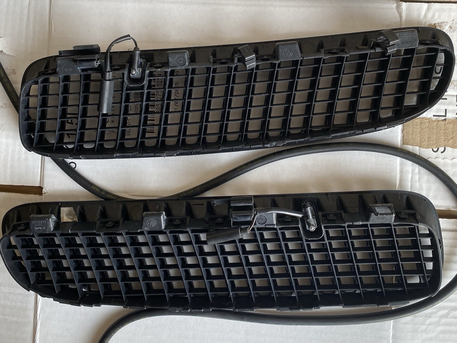 The product is a set of original hood top grilles for a 2004-2006 BMW E53 X5, made in Germany. The grilles come in a matt black finish and are designed to be placed on the left and right sides of the vehicle. Used part, a bit faded and broken clips. Washers work well.