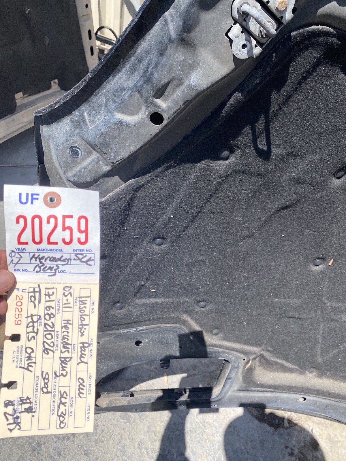 **_LOCAL PICK UP ONY & NO SHIPPING SERVICE_** **This is an ORIGINAL FACTORY PART, not an aftermarket one** 2005 2011 MERCEDES BENZ SLK CLASS HOOD INSULATION PANEL OEM **Description**: \- Surface has some scratches. **\- Tabs are complete.** \- It will come exactly as you see on pictures. \- You can contact us any question. We will received local pick ups We are located in LYNWOOD CA, feel free to email me if you have any questions. We are here to help, good luck. SHIPPING INFORMATION IS VERY IMPORTANT