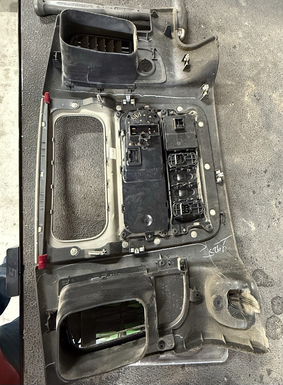 Dash bezel with climate control stuff out of a 2005 dodge ram laramie truck. Not perfect. Some of the flaps in one vent are broke. But clips on good and solid.